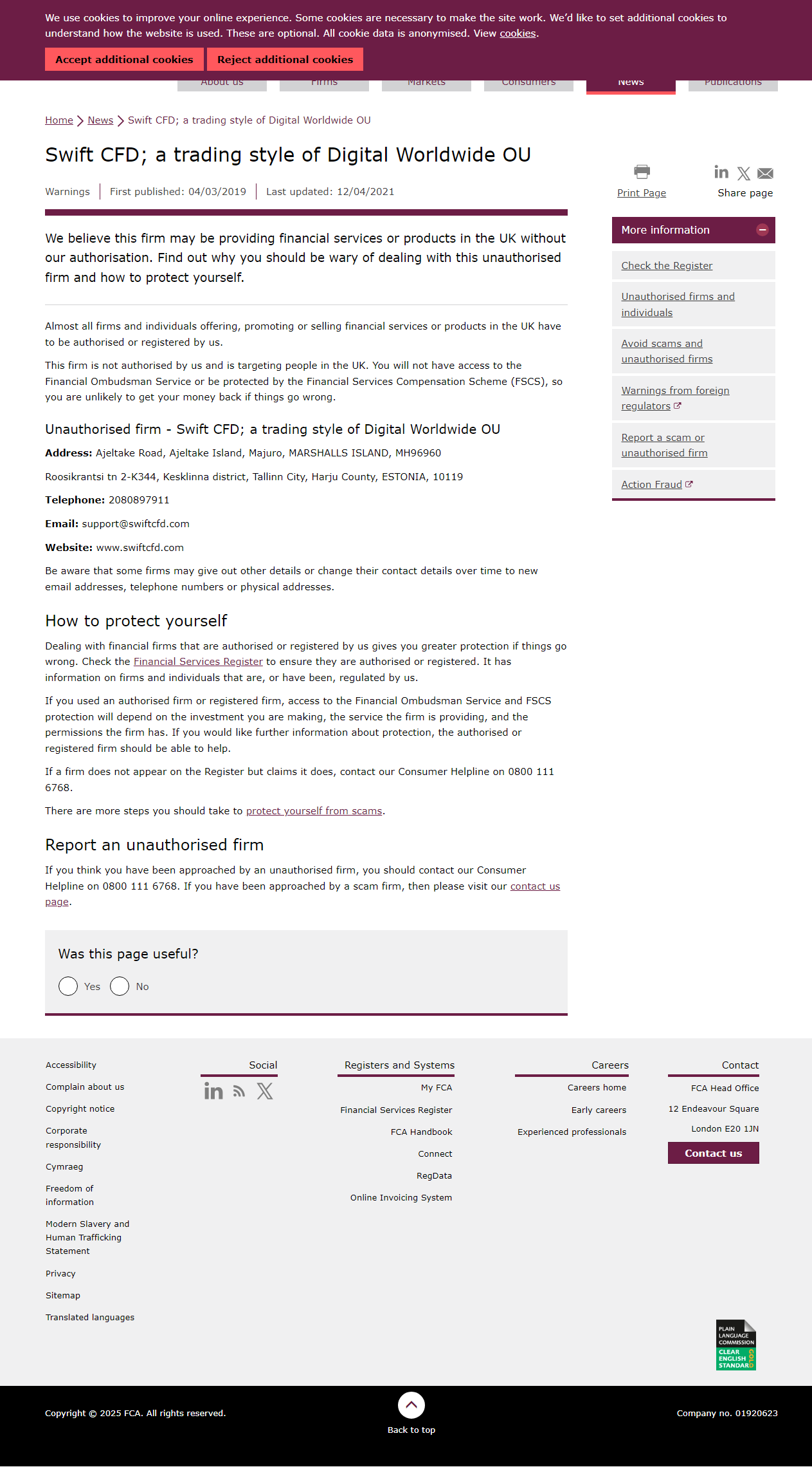 ['We believe this firm may be providing financial services or products in the UK without our authorisation. Find out why you should be wary of dealing with this unauthorised firm and how to protect yourself. Almost all firms and individuals offering, promoting or selling financial services or products in the UK have to be authorised or registered by us. This firm is not authorised by us and is targeting people in the UK. You will not have access to the Financial Ombudsman Service or be protected by the Financial Services Compensation Scheme (FSCS), so you are unlikely to get your money back if things go wrong. Unauthorised firm - Swift CFD; a trading style of Digital Worldwide OU Address: Ajeltake Road, Ajeltake Island, Majuro, MARSHALLS ISLAND, MH96960Roosikrantsi tn 2-K344, Kesklinna district, Tallinn City, Harju County, ESTONIA, 10119 Telephone: 2080897911 Email: support@swiftcfd.com Website: www.swiftcfd.com Be aware that some firms may give out other details or change their contact details over time to new email addresses, telephone numbers or physical addresses. How to protect yourself Dealing with financial firms that are authorised or registered by us gives you greater protection if things go wrong. Check the Financial Services Register to ensure they are authorised or registered. It has information on firms and individuals that are, or have been, regulated by us. If you used an authorised firm or registered firm, access to the Financial Ombudsman Service and FSCS protection will depend on the investment you are making, the service the firm is providing, and the permissions the firm has. If you would like further information about protection, the authorised or registered firm should be able to help. If a firm does not appear on the Register but claims it does, contact our Consumer Helpline on 0800 111 6768. There are more steps you should take to protect yourself from scams. If you think you have been approached by an unauthorised firm, you should contact our Consumer Helpline on 0800 111 6768. If you have been approached by a scam firm, then please visit our contact us page.']