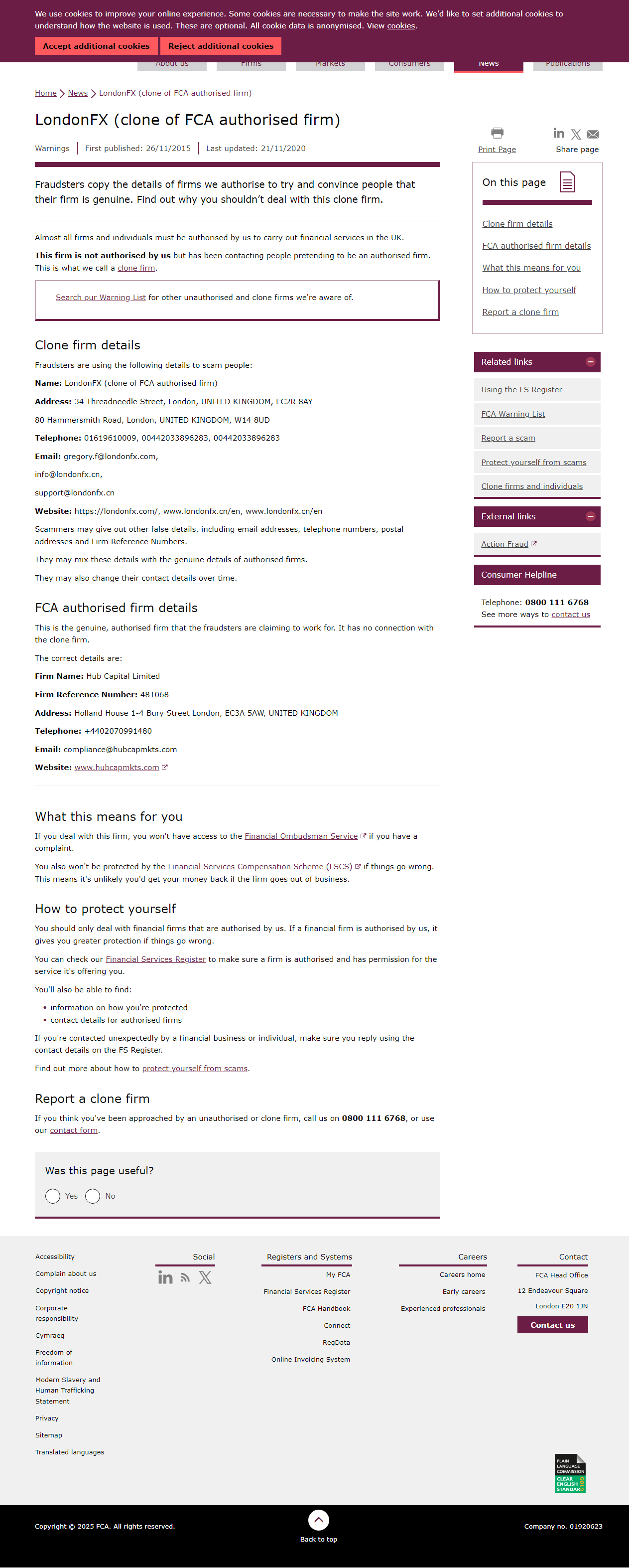 ['Fraudsters copy the details of firms we authorise to try and convince people that their firm is genuine. Find out why you shouldn’t deal with this clone firm. On this page Clone firm detailsFCA authorised firm details', "How to protect yourselfReport a clone firm Almost all firms and individuals must be authorised by us to carry out financial services in the UK. This firm is not authorised by us but has been contacting people pretending to be an authorised firm. This is what we call a clone firm. Search our Warning List for other unauthorised and clone firms we're aware of. Clone firm details Fraudsters are using the following details to scam people: Name: LondonFX (clone of FCA authorised firm) Address: 34 Threadneedle Street, London, UNITED KINGDOM, EC2R 8AY80 Hammersmith Road, London, UNITED KINGDOM, W14 8UD Telephone: 01619610009, 00442033896283, 00442033896283 Email: gregory.f@londonfx.com,info@londonfx.cn,support@londonfx.cn Website: https://londonfx.com/, www.londonfx.cn/en, www.londonfx.cn/en Scammers may give out other false details, including email addresses, telephone numbers, postal addresses and Firm Reference Numbers. They may mix these details with the genuine details of authorised firms. They may also change their contact details over time. FCA authorised firm details This is the genuine, authorised firm that the fraudsters are claiming to work for. It has no connection with the clone firm. The correct details are: Firm Name: Hub Capital Limited Firm Reference Number: 481068 Address: Holland House 1-4 Bury Street London, EC3A 5AW, UNITED KINGDOM Telephone: +4402070991480 Email: compliance@hubcapmkts.com Website: www.hubcapmkts.com "]