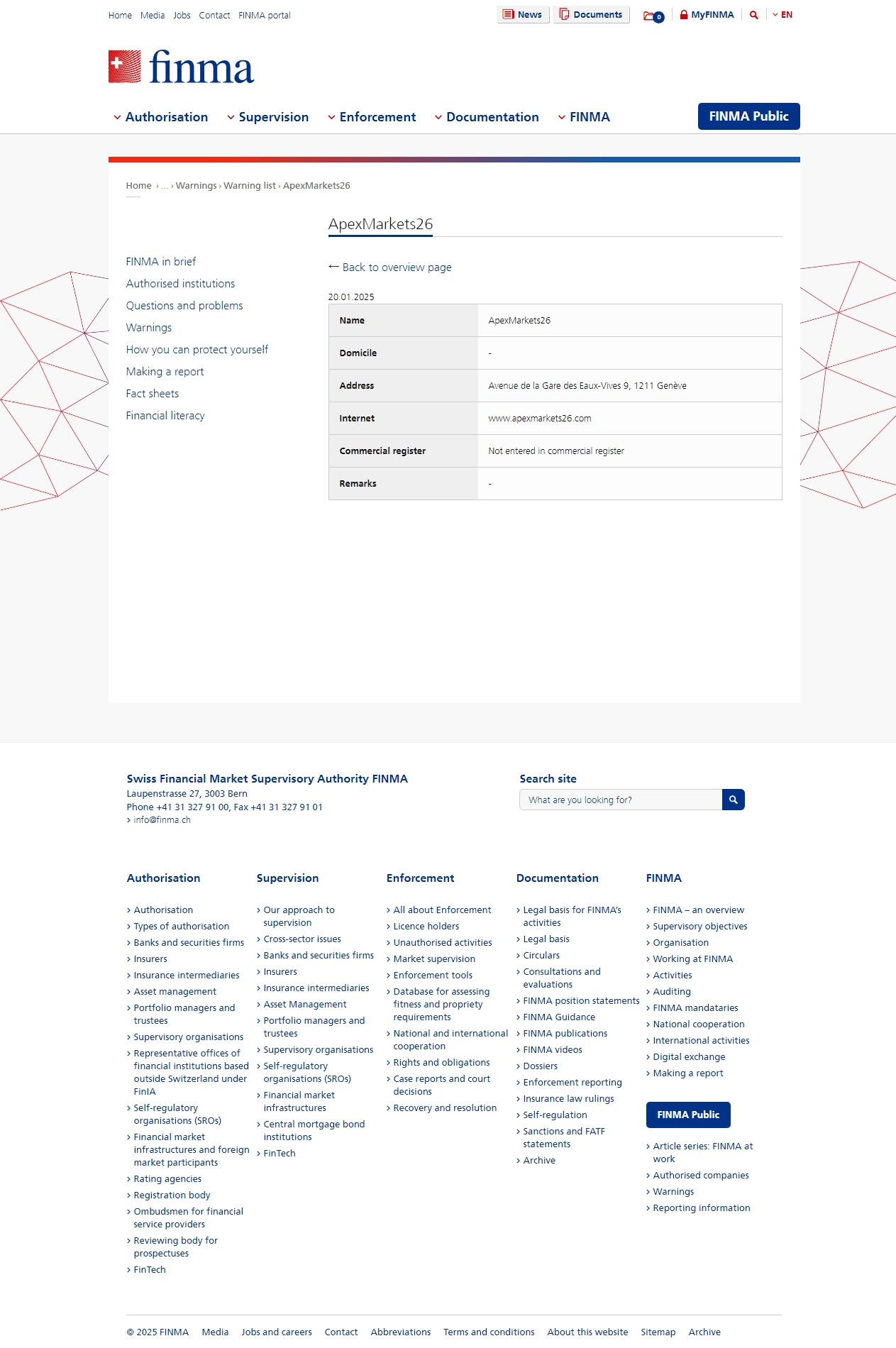 Warning list of unauthorised companies and individuals Public warning Warning list of companies and individuals who may be carrying out unauthorised services and are not supervised by FINMAApexMarkets26