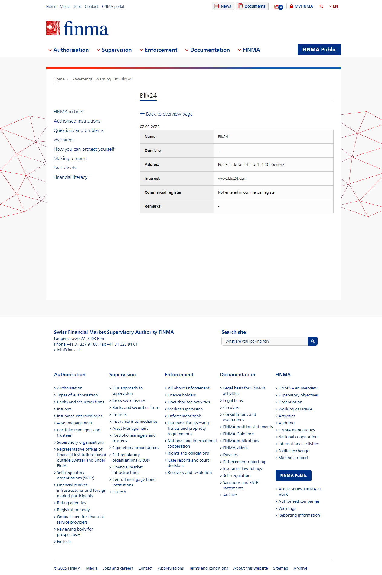 Warning list of unauthorised companies and individuals Public warning Warning list of companies and individuals who may be carrying out unauthorised services and are not supervised by FINMABlix24