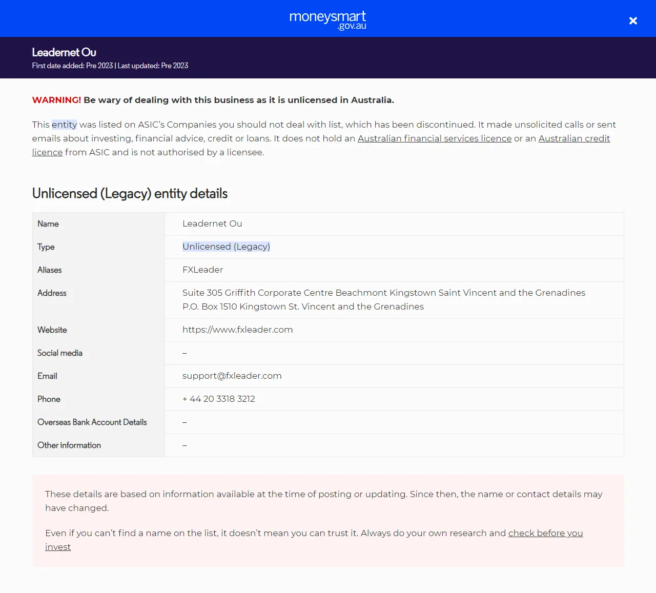 NameLeadernet Ou TypeUnlicensed (Legacy)An unlicensed entity. This entry is carried over from the‘companies you shouldnotdealwithlist’, which was discontinued in 2023. AliasesFXLeader AddressSuite 305 Griffith Corporate Centre Beachmont Kingstown Saint Vincent and the GrenadinesP.O. Box 1510 Kingstown St. Vincent and the Grenadines Websitehttps://www.fxleader.com Social media– Emailsupport@fxleader.com Phone+ 44 20 3318 3212 Overseas Bank Account Details– Other information–