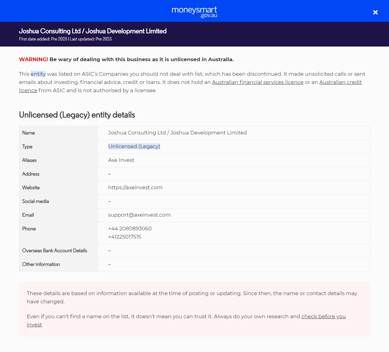 NameJoshua Consulting Ltd / Joshua Development Limited TypeUnlicensed (Legacy)An unlicensed entity. This entry is carried over from the‘companies you shouldnotdealwithlist’, which was discontinued in 2023. AliasesAxe Invest Address– Websitehttps://axeinvest.com Social media– Emailsupport@axeinvest.com Phone+44 2080893060+41225017515 Overseas Bank Account Details– Other information–