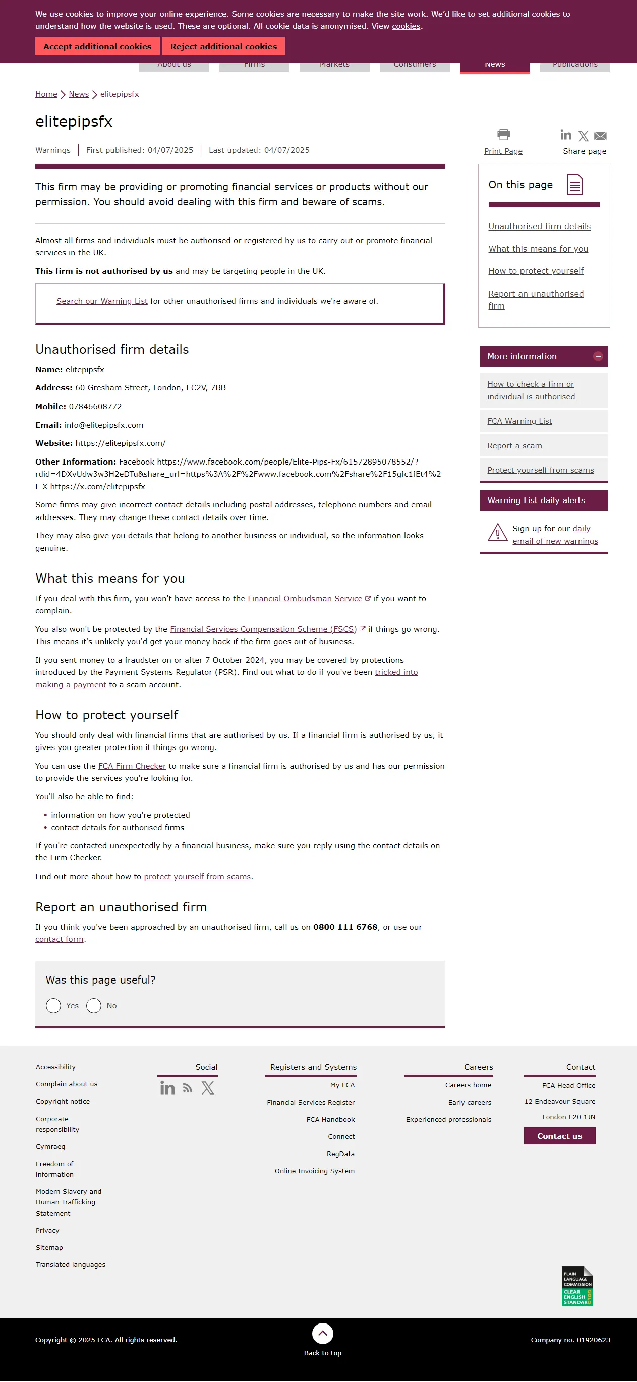 ['This firm may be providing or promoting financial services or products without our permission. You should avoid dealing with this firm and beware of scams. Almost all firms and individuals must be authorised or registered by us to carry out or promote financial services in the UK. This firm is not authorised by us and may be targeting people in the UK. Search our Warning List for other unauthorised firms and individuals we're aware of. Unauthorised firm details Name: elitepipsfx Address: 60 Gresham Street, London, EC2V, 7BB Mobile: 07846608772 Email: info@elitepipsfx.com Website: https://elitepipsfx.com/ Other Information: Facebook https://www.facebook.com/people/Elite-Pips-Fx/61572895078552/?rdid=4DXvUdw3w3H2eDTu&share_url=https%3A%2F%2Fwww.facebook.com%2Fshare%2F15gfc1fEt4%2F X https://x.com/elitepipsfx Some firms may give incorrect contact details including postal addresses, telephone numbers and email addresses. They may change these contact details over time. They may also give you details that belong to another business or individual, so the information looks genuine. "]