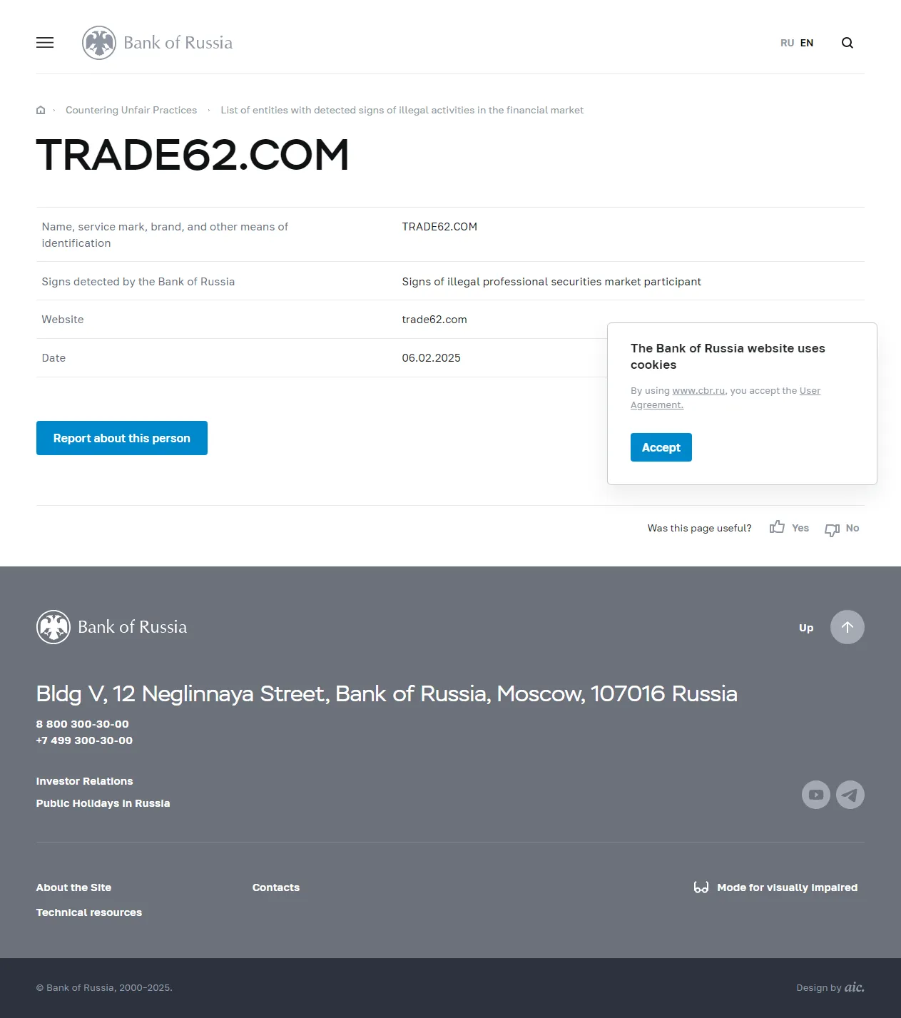 Name, service mark, brand, and other means of identification TRADE62.COM Signs detected by the Bank of Russia Signs of illegal professional securities market participant Website trade62.com Date 06.02.2025