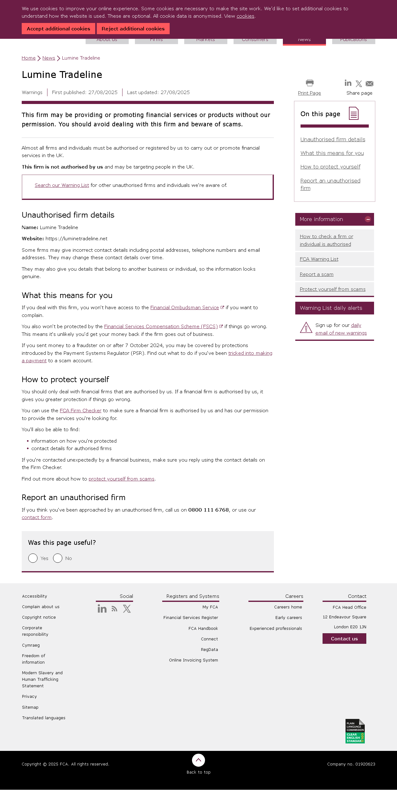FCA Warning List of unauthorised firms Lumine Tradeline