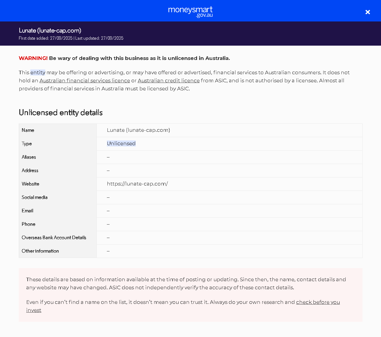 NameLunate (lunate-cap.com) TypeUnlicensedOffering financial services (including financial products) to people in Australia without a licence. They do not hold an Australianfinancialservices(AFS)licence or Australiancreditlicence from ASIC. Aliases– Address– Websitehttps://lunate-cap.com/ Social media– Email– Phone– Overseas Bank Account Details– Other information–