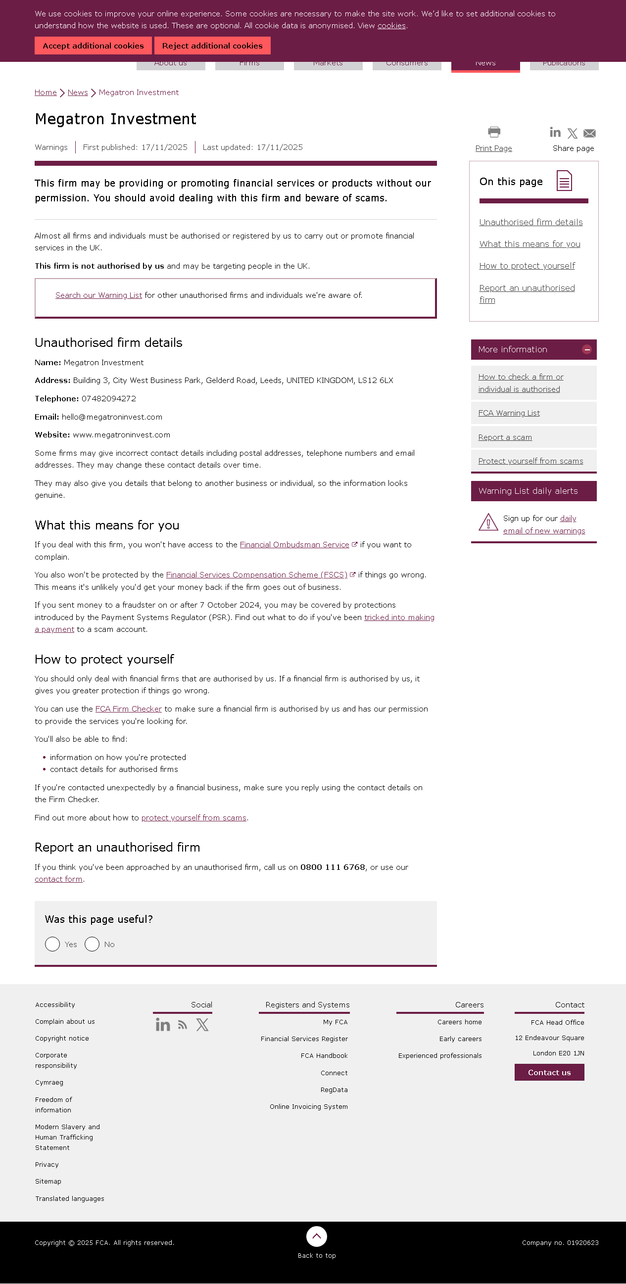 FCA Warning List of unauthorised firms Megatron Investment