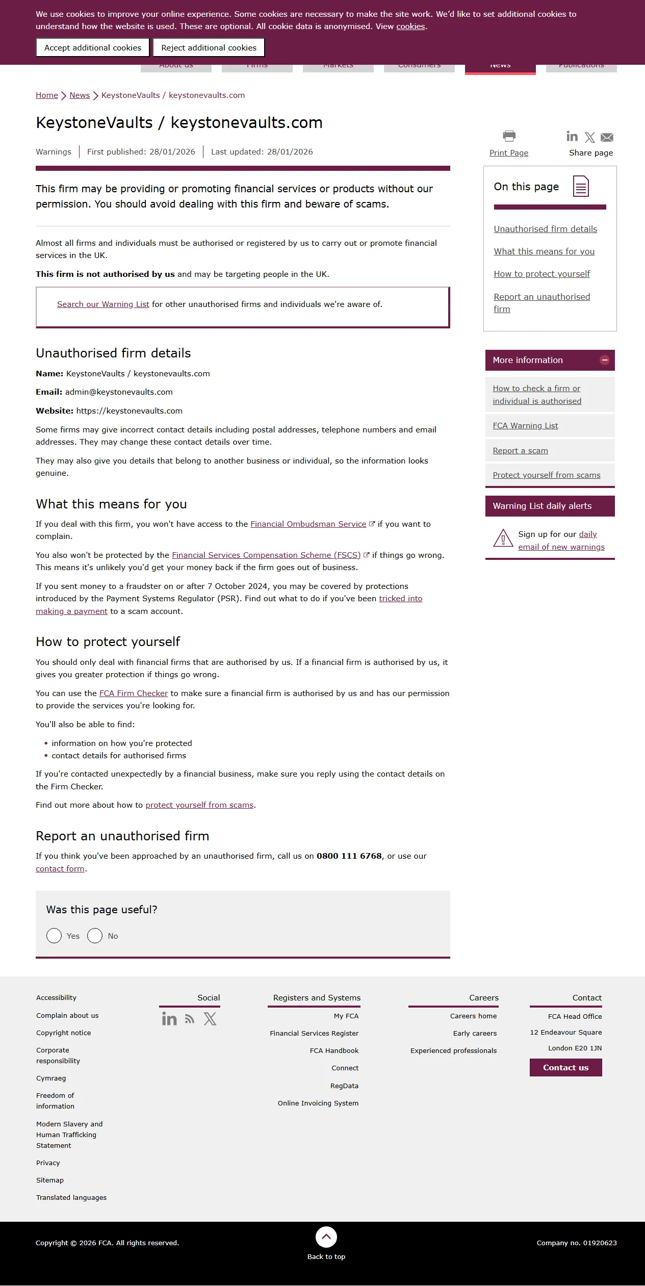 FCA Warning List of unauthorised firms KeystoneVaults / keystonevaults.com