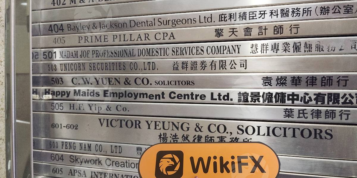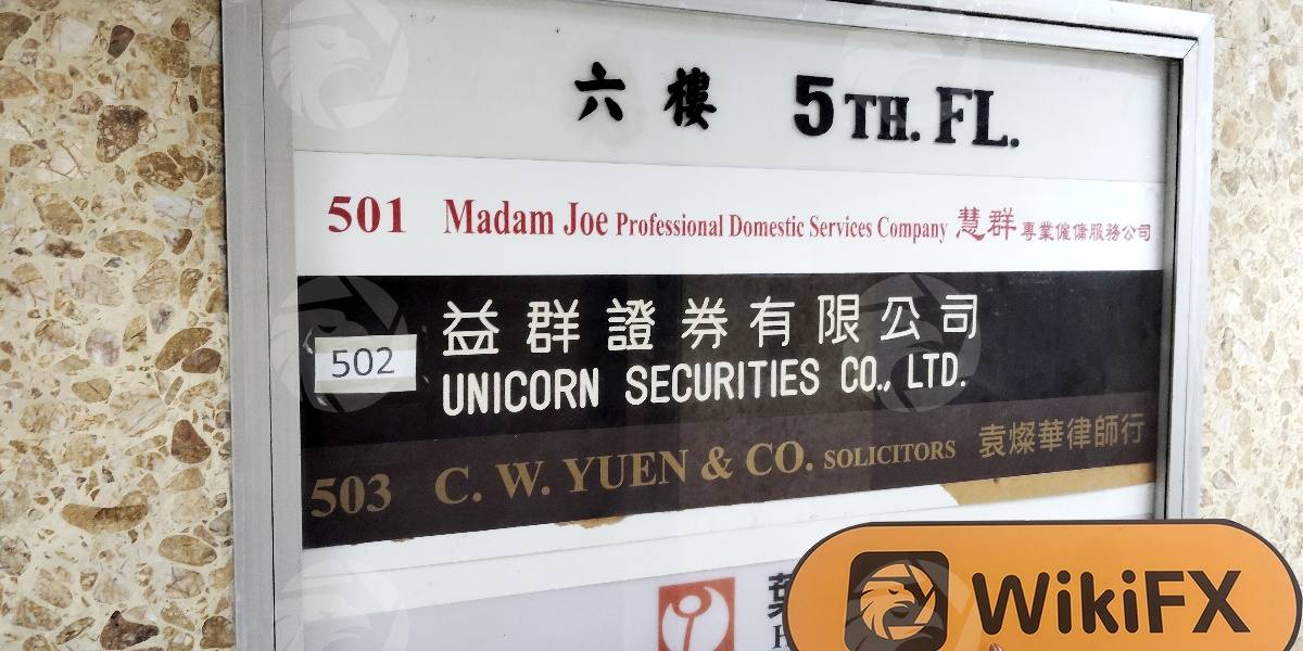 The on-site investigator visited the forex broker Unicorn Securities in Hong Kong, China as planned. The broker's company name and other information could be seen at its publicly displayed business address, indicating that the broker has a genuine business premises. Investors are advised to make their choices after comprehensive consideration.