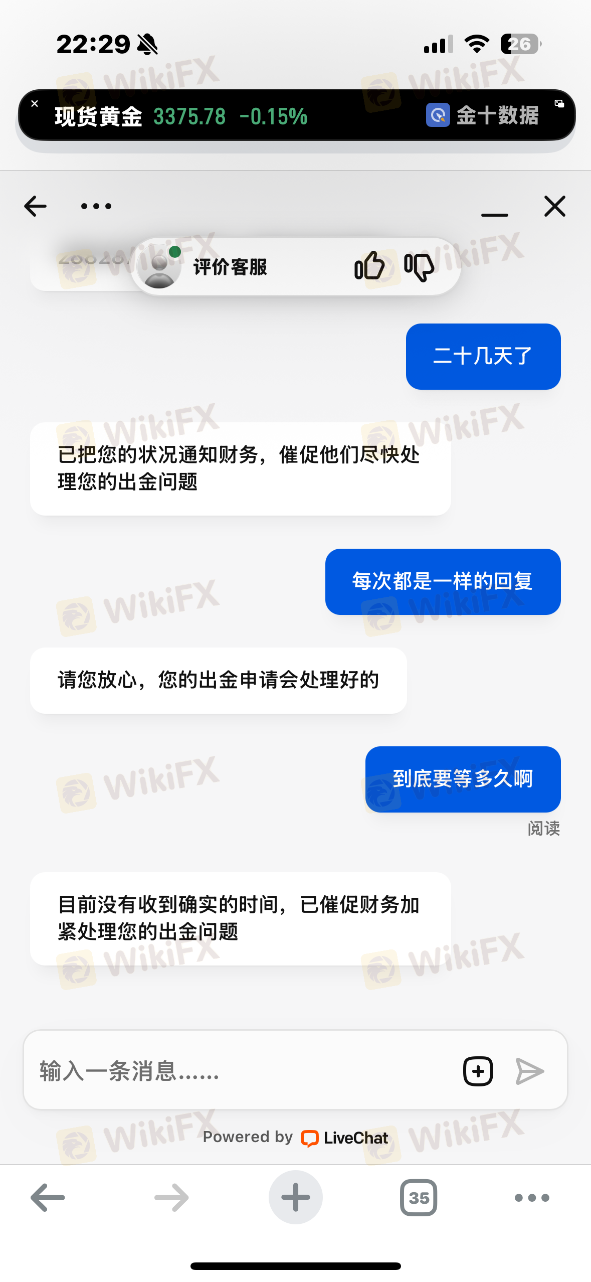从提交出金申请到今天,已经整整十几天过去,有些人甚至二十天还没到账,每次问客服说在“财务处理中”的状态。客服回复永远是“已把你的状况告知财务,催他们尽快处理您的出金”“请您放心,您的出金申请很快就会处理好”“请耐心等待”,可等待的日子里,焦虑像潮水一样越涨越高。 当初选择平台时,看中的是“快速到账”的承诺,如今承诺成了泡影,追问无门的感觉真的很糟。每一次刷新账户页面,每一次查看银行流水,换来的都是失望。资金安全是底线,出金效率是保障,可现在连最基本的到账时间都成了未知数。