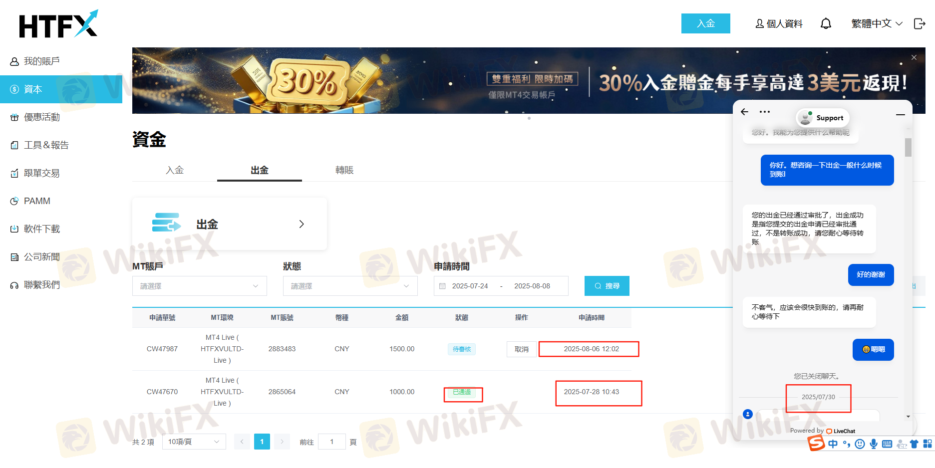 我在HTFX平台交易了一年多的时间,在7月之前的出金申请,都是正常到账,快则当天到账,慢则3天后才到账,效率并不高,但起码也能收到款。但在7月22日通过的出金申请,至8月4日仍未收到平台的转账。HTFX的客服也是一直回复我“已帮您催促财务加快处理您的出金问题,非常抱歉”,这样的话连续回复了我8天的时间,但收效甚微。我有理由怀疑这家公司已经不在正轨上了。希望能够得到公平对待,,尽快解决这件事。如果我的权益依旧不被保护,依旧无法出金,那是我选错了平台,被HTFX平台骗了。被扣下的资金就当是HTFX里的某些人替我挡灾了,呵呵。