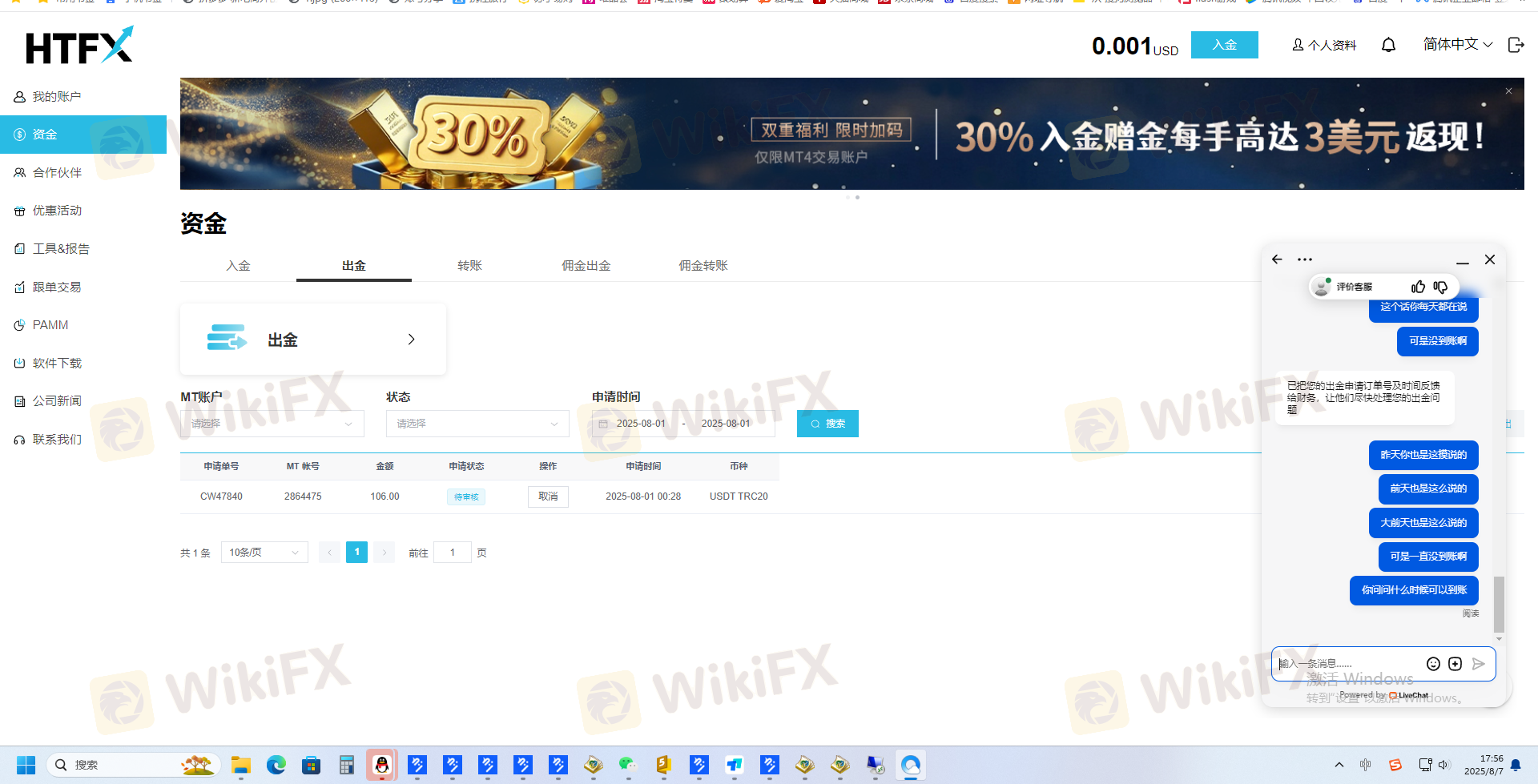 今天是2025年8月7号我在HTFX出金已经7天了一直没有到账问客服客服说尽快处理,可是一直没有到账。这个是黑平台大家请远离