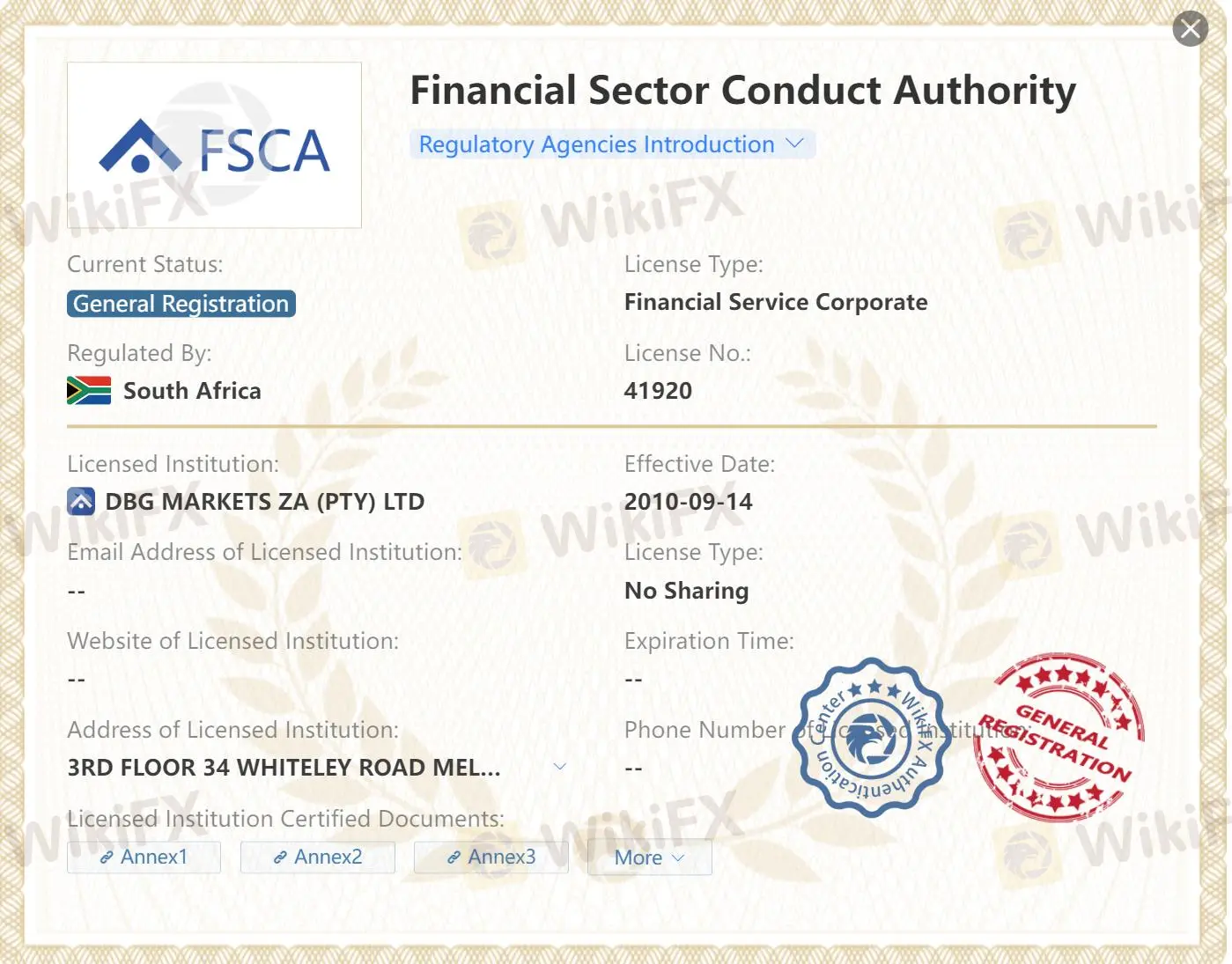• DBG MARKETS ZA (PTY) LTD,其在南非的实体,也已在南非金融行为监管局(FSCA)注册,持有金融服务公司许可证,许可证号码为41920。