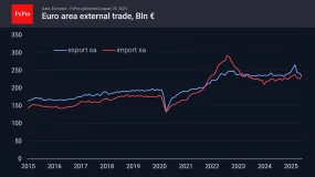 注:此文章由FxPro高级分析师Alex Kuptsikevich撰写关税导致外贸指标波动,欧洲也未能幸免。6 月,欧元区贸易顺差降至 70 亿欧元。经季节性因素调整后,顺差进一步降至 28 亿欧元,为 2023 年 5 月以来的最低水平 —— 当时欧洲受能源价格飙升及对俄罗斯供应中断的影响,致使物流成本上升。1 月至 3 月,月度出口较前两年的平均水平增长逾 10%,推动贸易顺差出现暂时性激增。