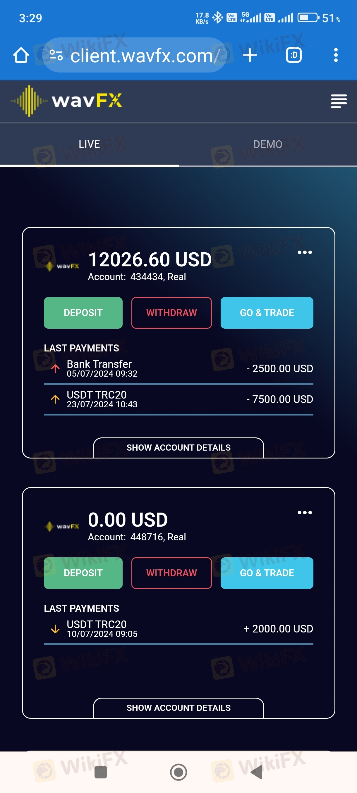 Unable to withdraw I have invested in wavfx 2500 usd Three months still have not given withdrawal 12000 USD in my account They told you must pay for withdrawal 1000 usd for merchant