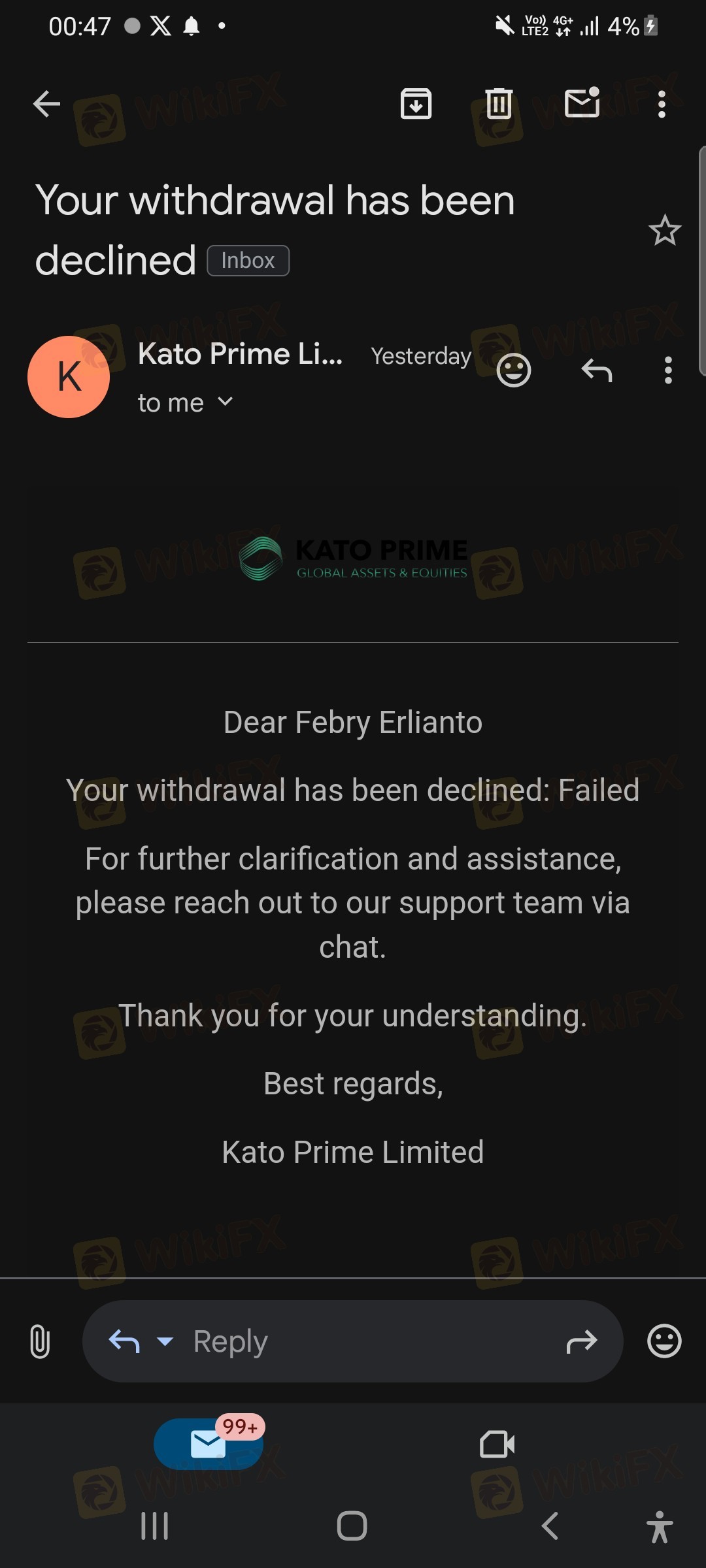 When I was about to withdraw my funds, Kato suspended my bonus account due to the suspicion of multiple accounts. I only use Wi-Fi, and other family members also use the same Wi-Fi and trade on Katoprime. When I sought clarification, Kato only explained that my account was suspected of being a multiple account, not definitively so. Furthermore, upon reviewing the terms and conditions, there is no clause prohibiting the use of a shared network (Wi-Fi). If there is indeed a rule against using the same Wi-Fi, it should have been clearly stated to prevent any party from being disadvantaged by this lack of clarity.