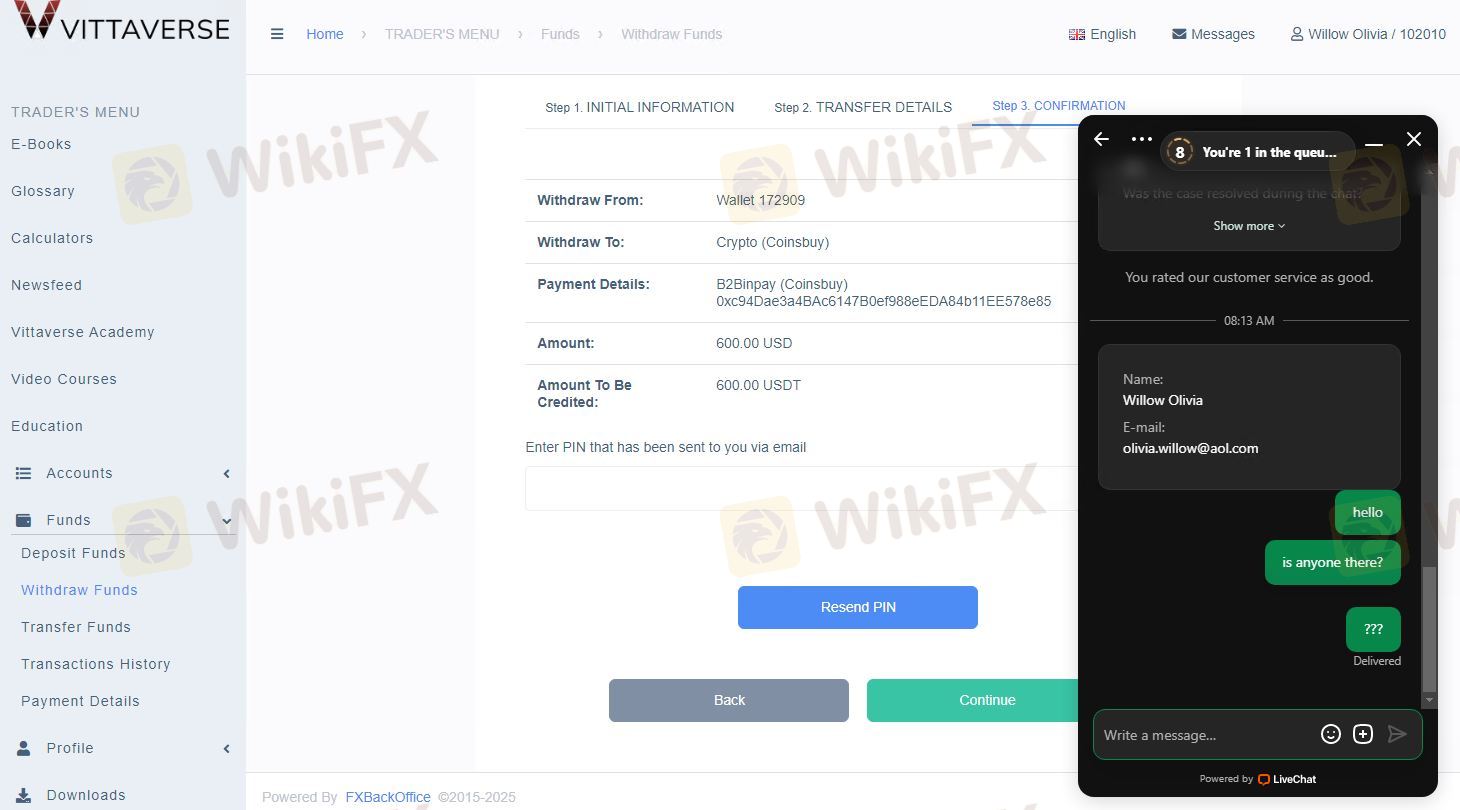I was depositing with Vittaverse 600 usd in my account 691959 and traded for about a month but when I wanted to make my first withdrawal they were canceling all my profits. I can not even withdraw my deposit as they are not sending me the withdrawal pin code. I have been emailing Support for assistance and spoke to customer service live chat but no one is willing to help me withdraw my money.