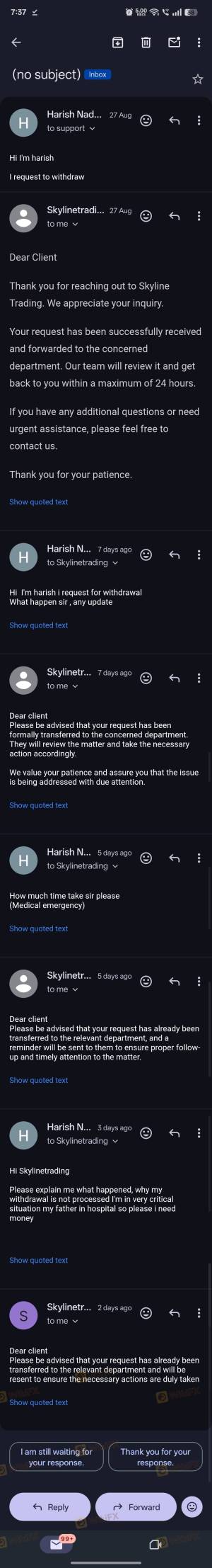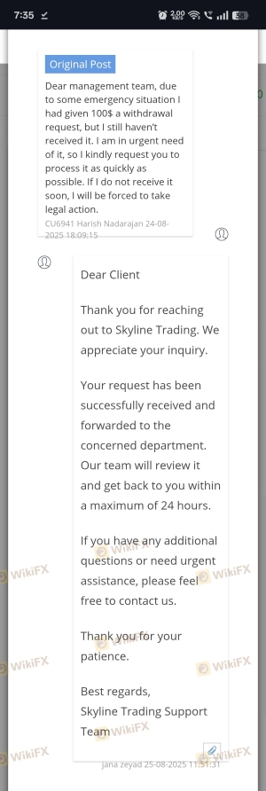 I am filing a complaint against Skyline Markets Limited for failing to process my withdrawal request. My account details: Client ID: CU6941 MT5 Account Number: 211295 Account Balance: USD 832 On August 13, 2025, I submitted a withdrawal request. Today, more than one month has passed, but my withdrawal has not been processed. In this time, I have made several follow-up attempts: 20 times I submitted MT5 to Wallet transfer requests 3 times I created support tickets 5 times I sent emails Still, I have received no response and my funds remain blocked. I deposited funds in good faith and completed all required verifications. My account is valid and active, yet the broker is not releasing my money. This shows serious issues with their reliability. I request to investigate this case and take necessary steps to help me recover my funds from Skyline Markets. Proofs available: Crypto deposit transaction hash and wallet address Withdrawal request screenshots