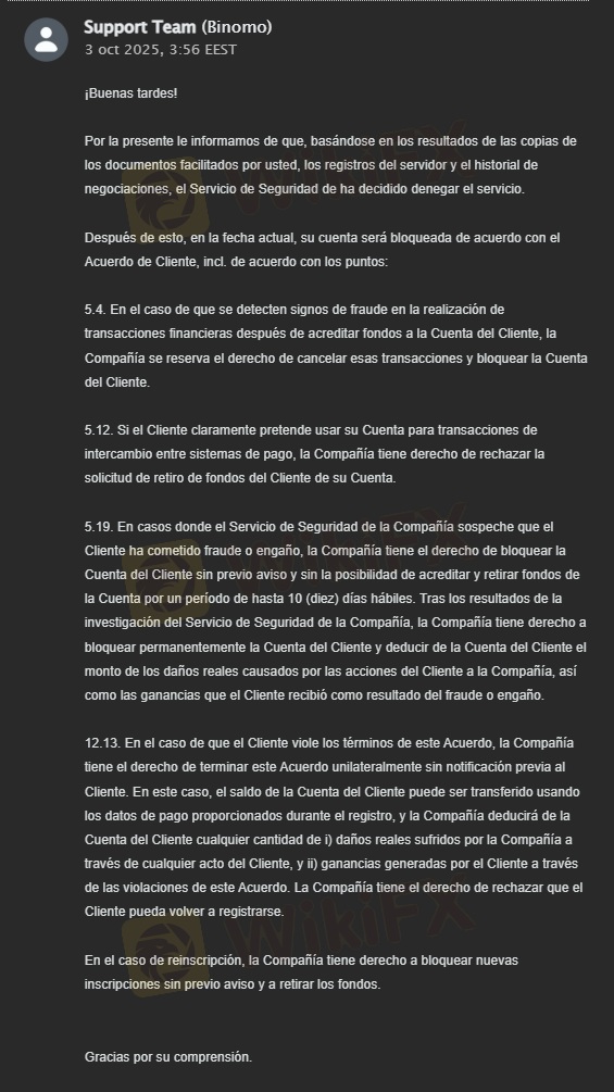 Después de un tiempo de hacerle muchos depósitos, validaciones de cuenta, empezaron a denegarme los retiros. La ventana aparecía con la leyenda "retiros suspendidos", contacté a soporte y éste solo daba respuestas automáticas. A los días me bloquearon permanentemente la cuenta, solo explicaron que fue por "acciones sospechosas y fraude" y dejaron de contestar, se quedaron con mi dinero invertido y mis ganancias. Perdí cerca de 15 mil dólares en ese broker, quedé en banca rota. No se dejen engañar, ese broker dejó de ser confiable. No pierdan su patrimonio, su tiempo ni su dinero EN BINOMO. No les va a respetar ni su dinero ni su cuenta.