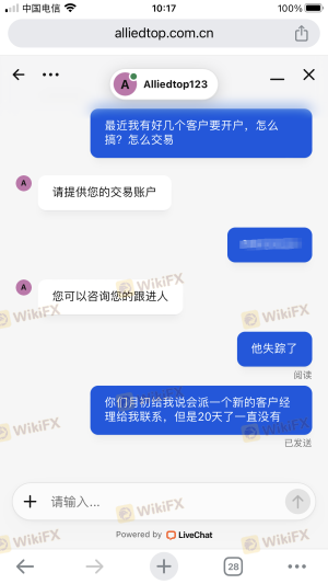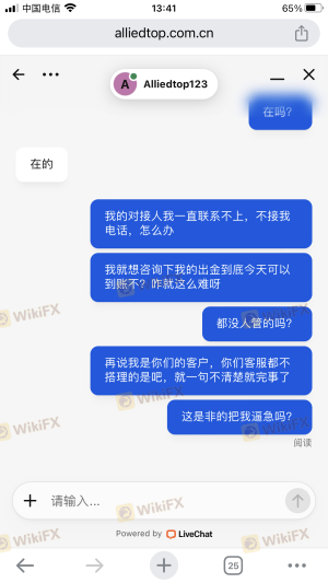 63万资金无法出金,目前已经20天了,前几天是咨询在线客服,一直让我联系我的对接人,可是我对接人是信息不回,电话不接,现在干脆官网直接关闭了在线聊天窗口,全部失联