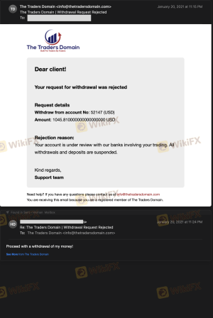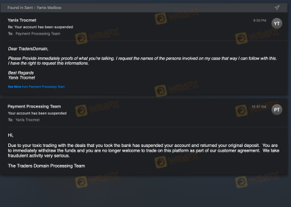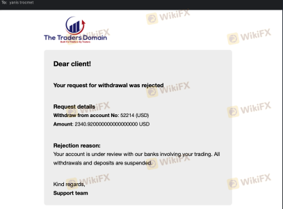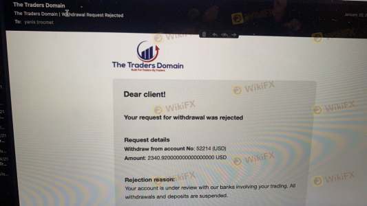 我在这家公司交易了将近一个月,当时他们冻结了我的资金和账户。我试图出金,但他们没有批准。当我要求解释时,他们甚至没有回复我的电子邮件。The Traders Domain不是受监管的交易商。他们拉黑了我的电子邮件,所以我无法回复他们。请求 FPA 帮助解决我的问题,但他们都没有回应。谢谢。
