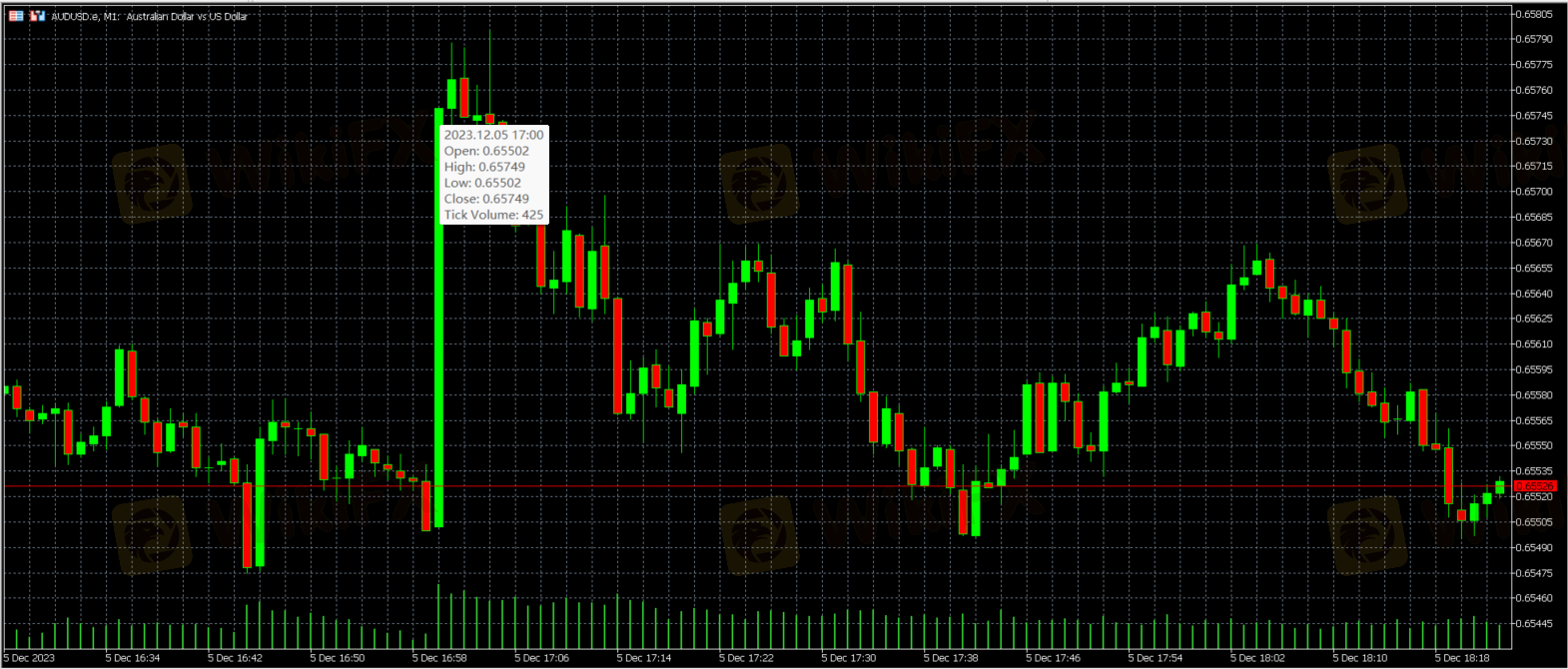 实际公布ISM服务业指数数据52.7高于预期的52.2,随着商业活动和就业的回升,美国服务业在11月回暖。但是另一方面,11月的职位空缺数据为8.73M,远低于预期的9.31M,是自2021年3月以来最低点,显示美国劳动市场正在降温。数据公布后(澳洲东部时间2:00am,06.12.2023)AUD/USD在五分钟内迅速上涨,从0.65502上涨至0.65740,期间最高点触及0.65795.