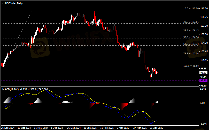 日线图显示美元指数于低位区间震荡,当前承压于99.90阻力。从MACD来看,快慢线金叉依旧,白色动能柱温和增量。指数走势基本和动能柱的变化一致。