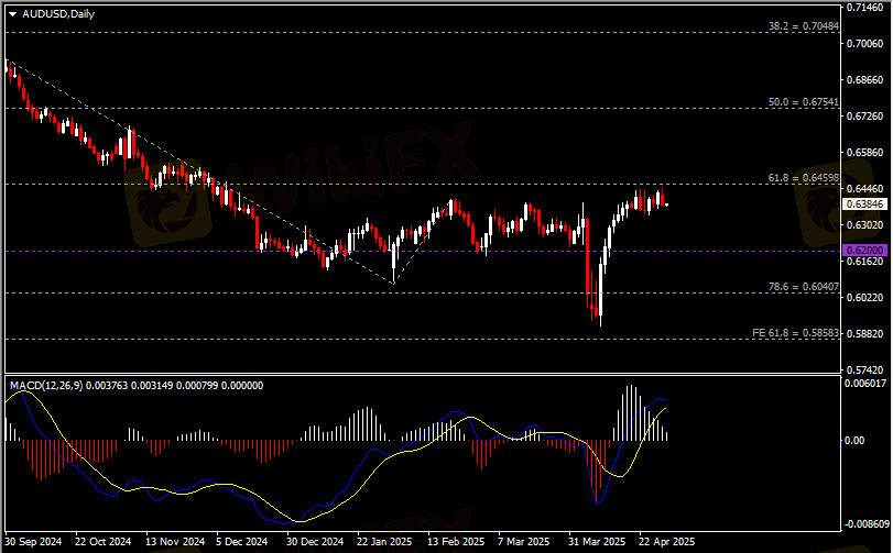 日线图显示澳元兑美元遇阻回落,当前承压于0.6460阻力。从MACD来看,快慢线呈拐向,白色动能柱温和收缩。汇价走势基本和动能柱的变化一致。