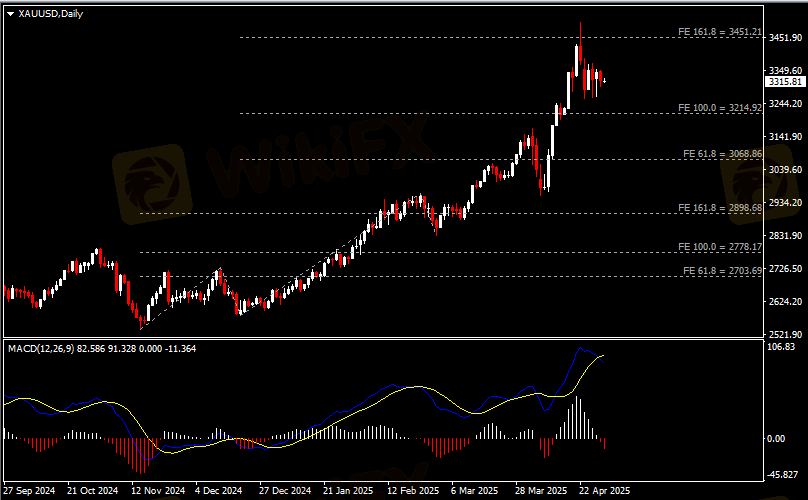 日线图显示金价小幅下跌,当前承压于3450阻力。从MACD来看,快慢线死叉依旧,红色动能柱温和放量。金价走势基本和动能柱的变化一致。