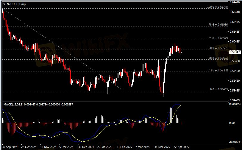 日线图显示纽元兑美元回调走弱,当前收于前低0.5960。从MACD来看,快慢线形成死叉,白色动能柱收缩殆尽。汇价走势基本和动能柱的变化一致。