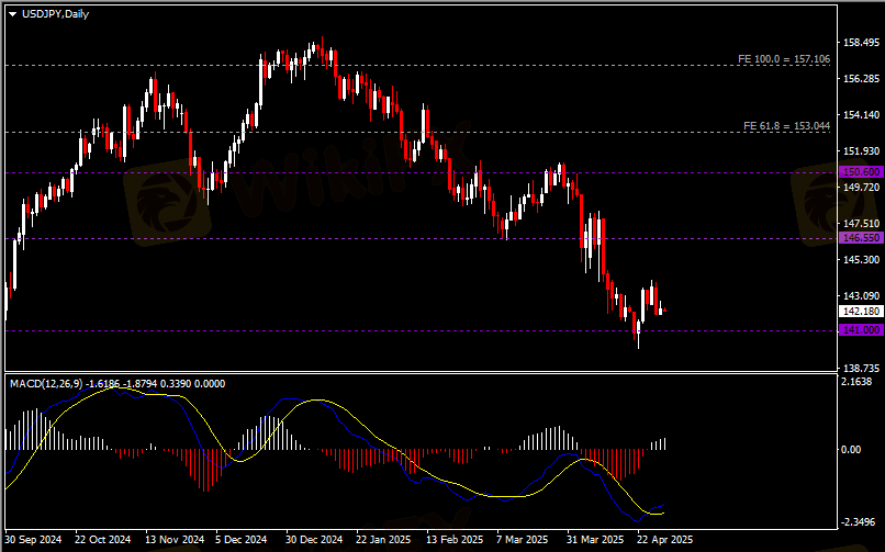 日线图显示美元兑日元小幅收涨于141关键支撑。从MACD来看,快慢线金叉依旧,白色动能柱温和放量。汇价走势基本和动能柱的变化一致。
