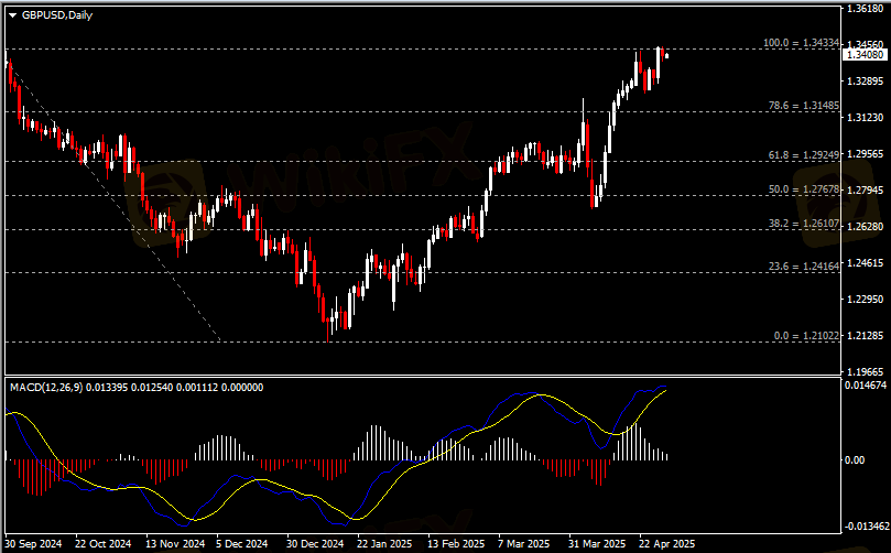 日线图显示英镑兑美元小幅回调,当前承压于1.3430阻力。从MACD来看,快慢线逐渐收窄,白色动能柱温和收缩。汇价走势基本和动能柱的变化一致。