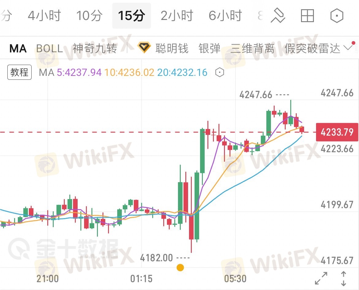 技术面态势:日线级别收出突破性阳线,MACD金叉持续放量;4小时布林带开口向上,均线呈多头排列,KDJ指标维持强势区间,确认短期上涨趋势。即时支撑位为4210美元,前期震荡上沿4185美元构成强支撑;阻力方面聚焦4247.9美元前期高点,突破后有望看向4300美元。