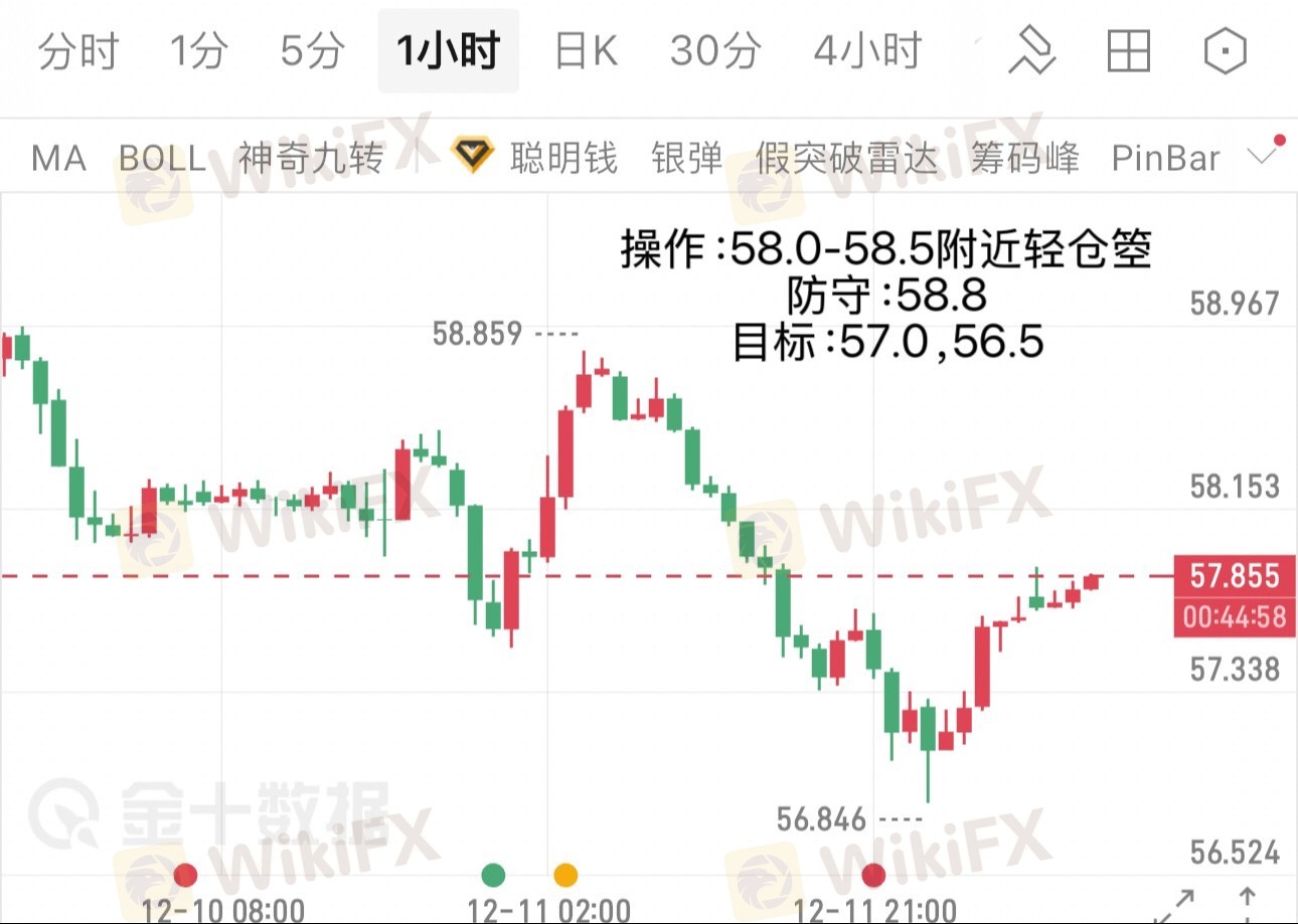日线级别呈次要震荡且向56低点测试,1小时图大趋势仍为空头,价格从58.859高点单边下跌至56.846低点,现价57.855处于反弹修正阶段,不过均线系统仍呈空头排列,下行趋势未发生根本逆转;