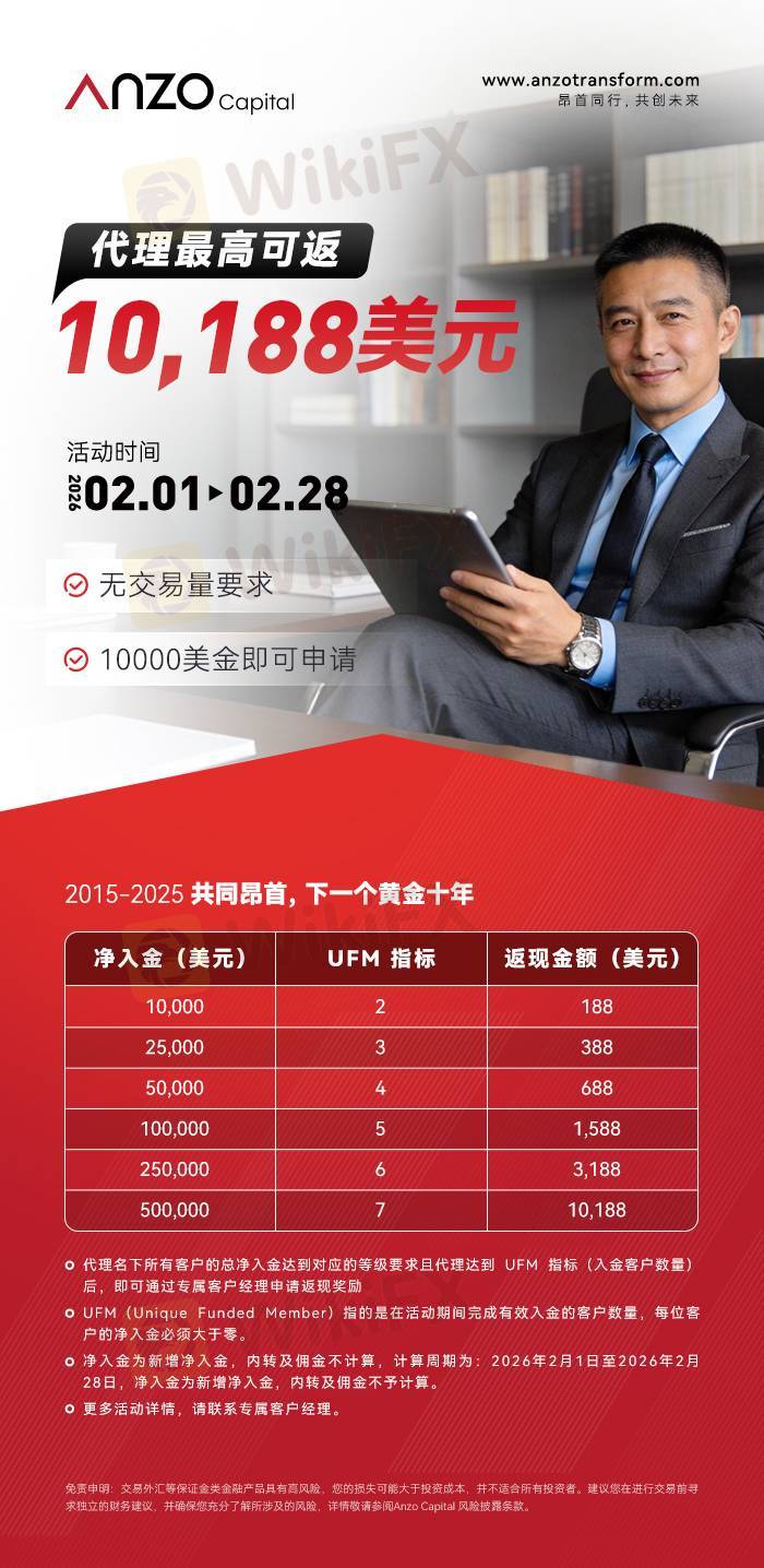 结算方式:平仓结算 EA交易:支持 外佣:支持 返佣手续费:支持 高评分靠谱平台,口碑相传。Anzo昂首凭借优质服务赢得用户信赖,代理推广阻力小,成单率高,事业起步更轻松。
