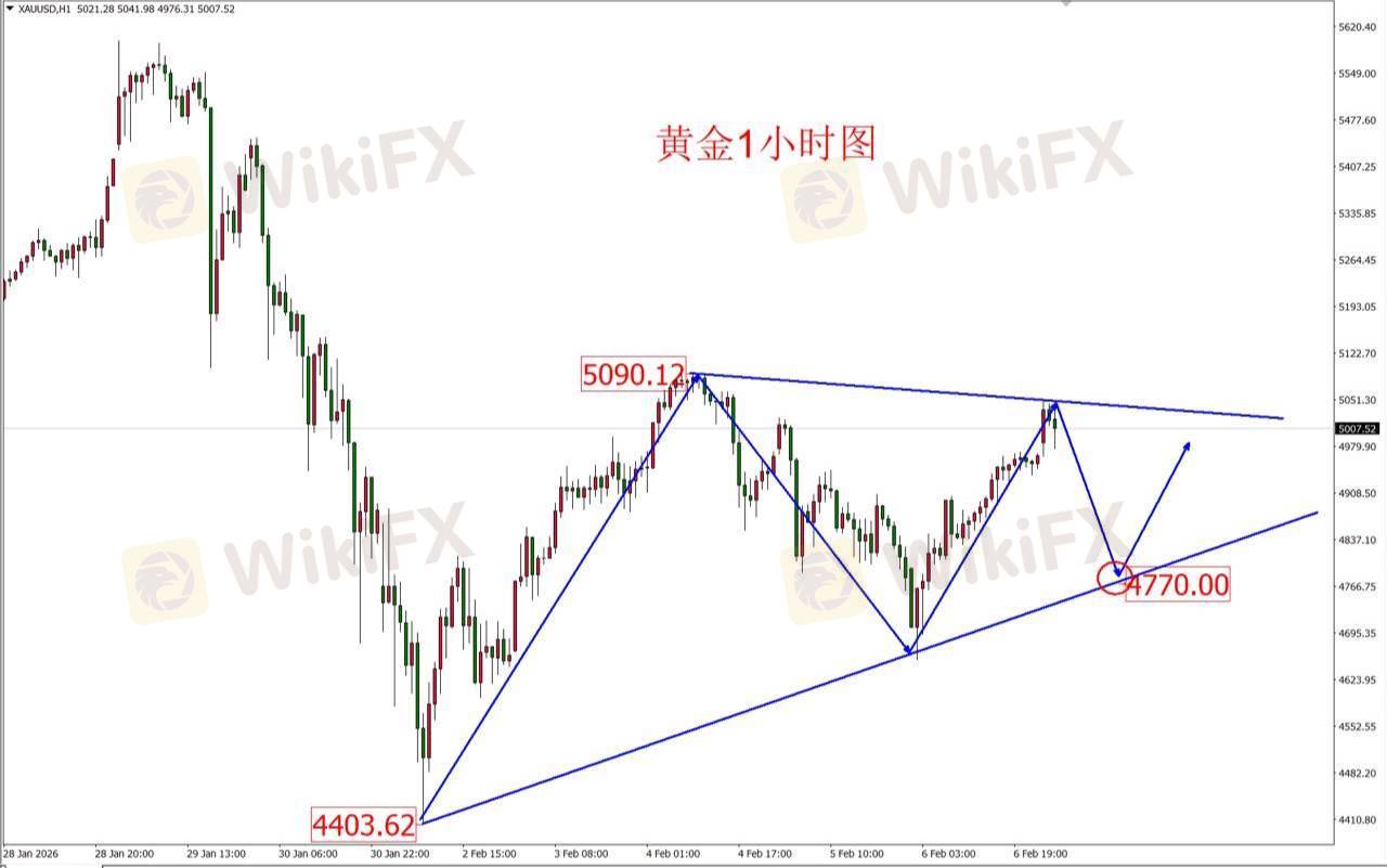 技术分析:黄金暂时先看一个收敛三角形的技术结构,目前低点在不断抬高,早上冲高后,暂时有受阻回落的迹象,看能不能形成有效回落。如果回落,关注三角形下轨支撑,点位在4770附近,这里也是4小时维加斯通道的强支撑,回调此处继续做多。