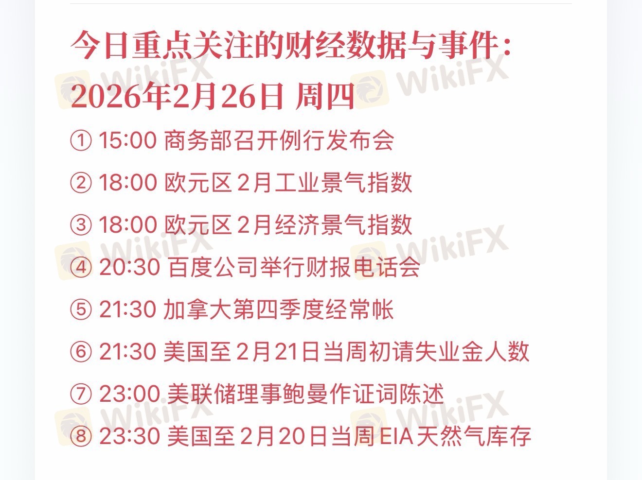 2026年2月26日(周四)全球市场关键节点一览:商务部发布会、欧元区景气数据、百度财报电话会、美国初请失业金及美联储官员讲话等重磅事件密集登场,每一项都可能成为市场波动的重要推手,交易与决策需精准把握节奏。