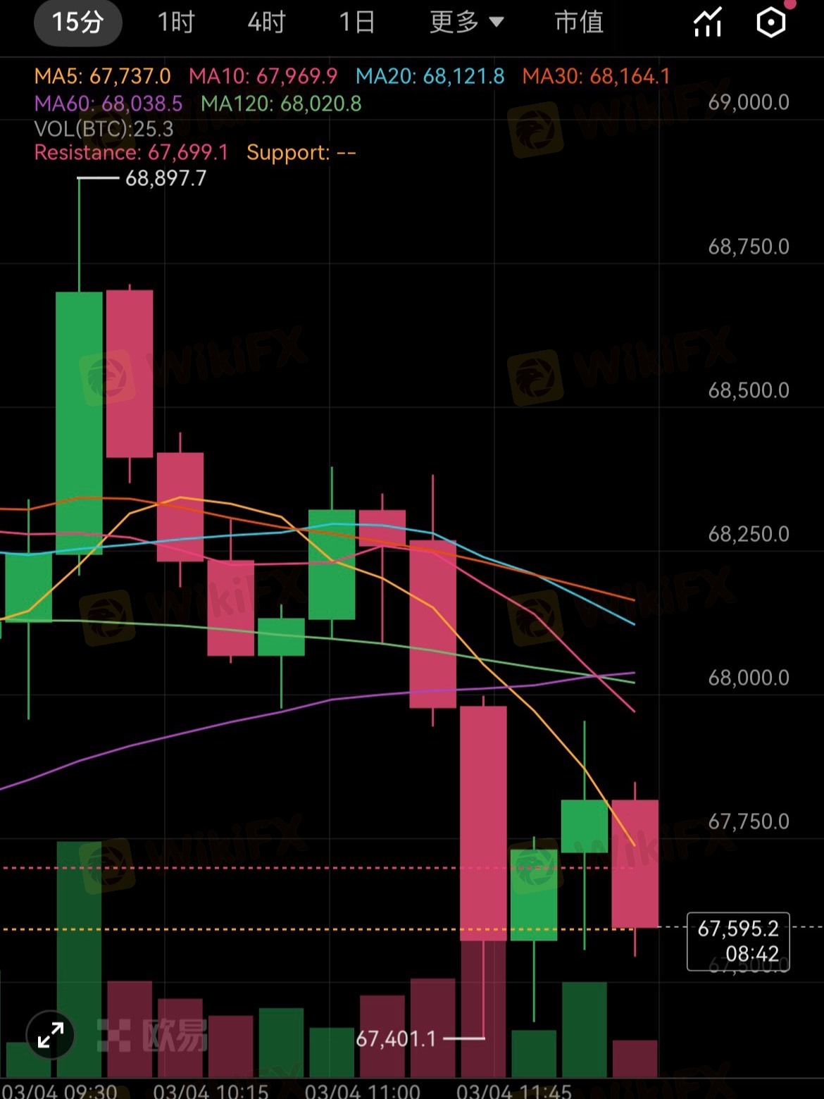 现在小时级别是一波多头趋势所以不能跌破价格通道,跌破价格通道就会出现更低的低点,小时级别的多头趋势就会被破坏。当下的大饼反弹受阻于68970并且多次向上插针都没有突破68970阻力,回踩又没有跌破下方的67525的支撑,上不去下不来会围绕68970-67525走盘整震荡。