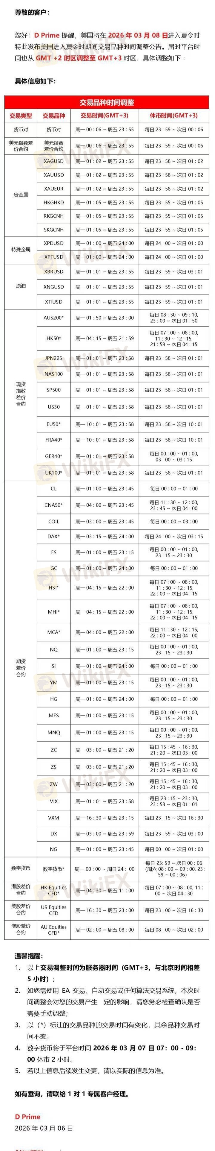 重要通知!D Prime 提醒,美国将在 2026 年 03 月 08 日进入夏令时。请留意,以下品种交易时间将发生变化,期间其他品种不会受到影响,均按正常交易时间交易。