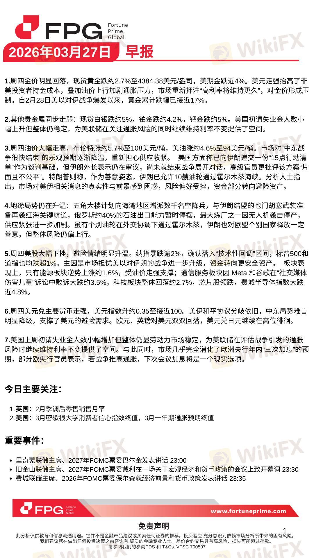 不要轻信任何美媒的消息,价格能反映一部分但不是全部。当前国际局势高度不确定,“少做多看”更重要。 风险提示: 1⃣ 警惕“金融+舆论”组合拳,防止被情绪带节奏、被动站在收割的一侧。 2⃣ 近期所有原油及相关化工品都是“高波动+高风险”组合,谨慎入市,严格控制仓位。 3⃣ 周五特别注意获利了结盘,防范集中平仓带来的剧烈回撤。 2026/03/27 市场简报: 🟡 黄金 & 贵金属 - 黄金周四继续回落,现货金跌约2.7%,自2月末美以对伊冲突爆发以来累计跌幅接近17%。 - 美元走强+油价上行推升通胀预期,“高利率更久”再度压制金价。 - 白银、铂金、钯金齐跌,风险资产整体承压。 🛢 原油 & 地缘 - 油价大涨:布伦特约涨5.7%,美油涨逾4%。市场对“中东很快停火”的幻想降温,重新担心供应收紧。 - 美方抛出“15点方案”,伊朗称“片面且不公平”,外长还没正式谈停火,地缘紧张仍在升温。 - 五角大楼增兵海湾、胡塞武装威胁再袭红海航道、俄罗斯部分出口和炼厂受损,供应端风险进一步放大。 📉 美股 - 美股周四大跌:纳指跌超2%进入技术性回调区间,标普和道指也跌逾1%。 - 战争升级预期+科技、芯片领跌,只有受油价支撑的能源板块逆势收红。 💵 汇市 & 利率预期 - 美元指数逼近100,避险需求推升美元,欧元、英镑走弱,日元维持高位震荡。 - 美国就业数据仍稳,为美联储按兵不动、继续观察战争与通胀影响提供了空间;市场几乎完全接受欧央行年内多次加息的预期,若战事推高通胀,欧央行“加得更快”成为现实选项。 🔔 操作建议(仅作参考,不构成投资建议): - 高波动阶段,宁可少赚也不要重仓“赌方向”; - 避免情绪单、新闻单,严格用仓位和止损说话; - 尽量减少隔夜与周末持仓,特别是原油及与中东高度相关的品种。