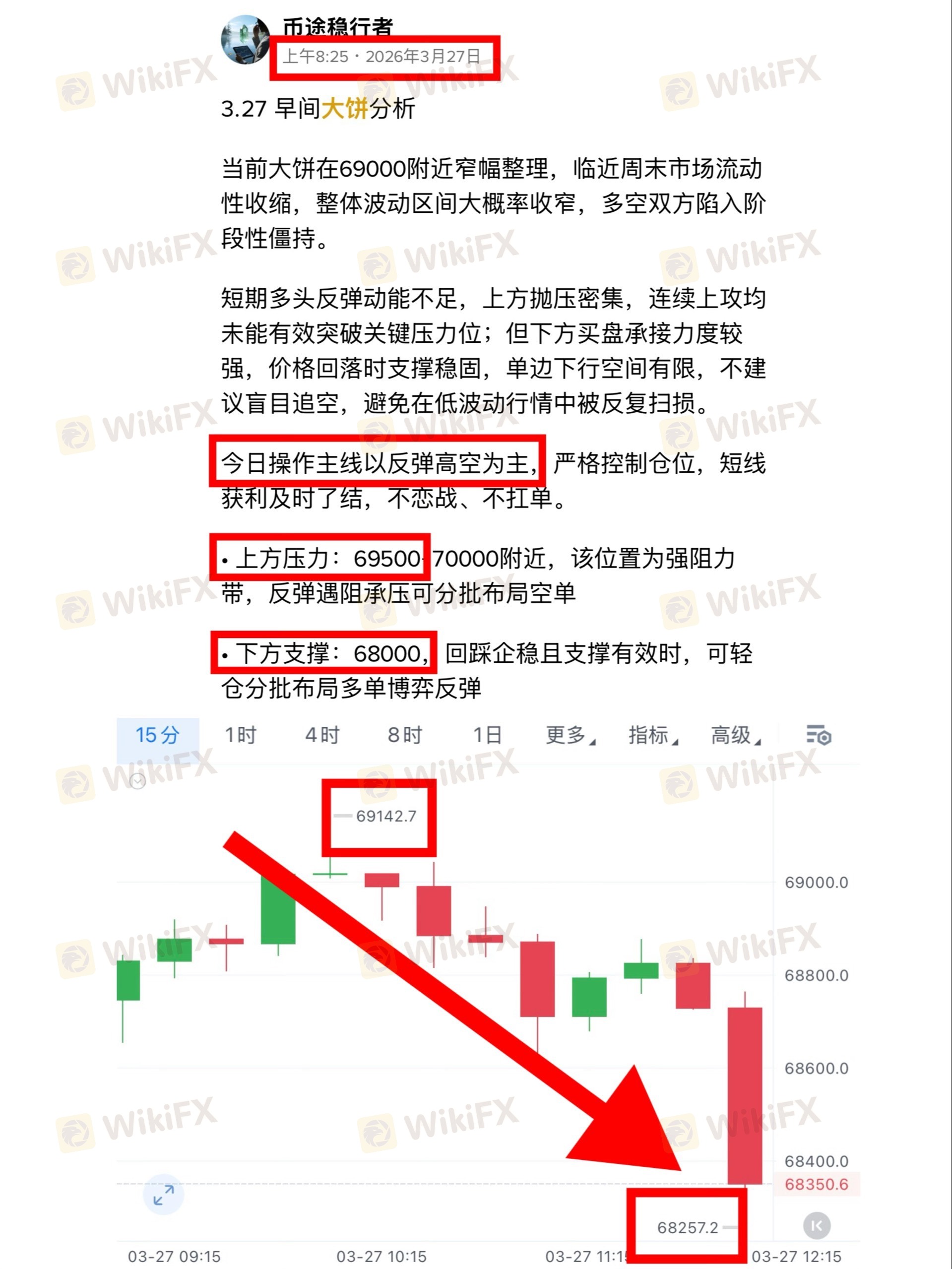 价格在69142承压回落,最低触及68257