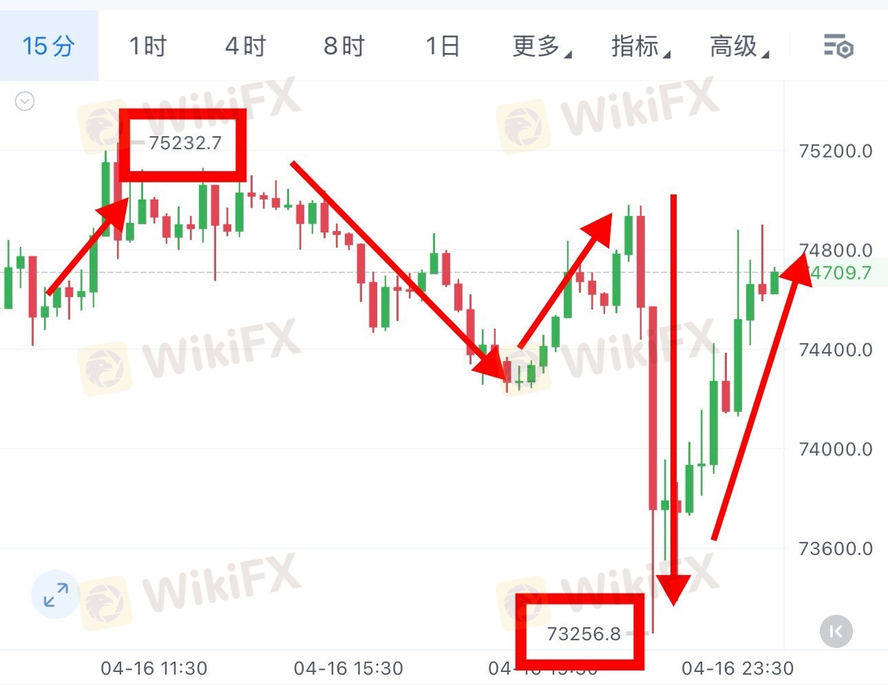 回调下探至74000一线第一支撑位后如期止跌企稳,随即开启反弹回升。