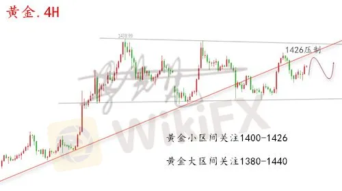 2、短线上看,早盘黄金冲高1428承压,小时图连阳推动上涨,阳K线数量过多,阴阳循环是正常规律,孟梵认为短线或要伴随阴线回撤确认,操作上不去追多,下方留意1418支撑情况,同时需要注意的是欧美盘能否再次破高,不能强势收复1438高点的话,仍要防止承压收低。