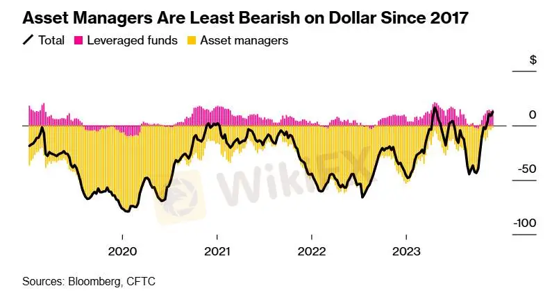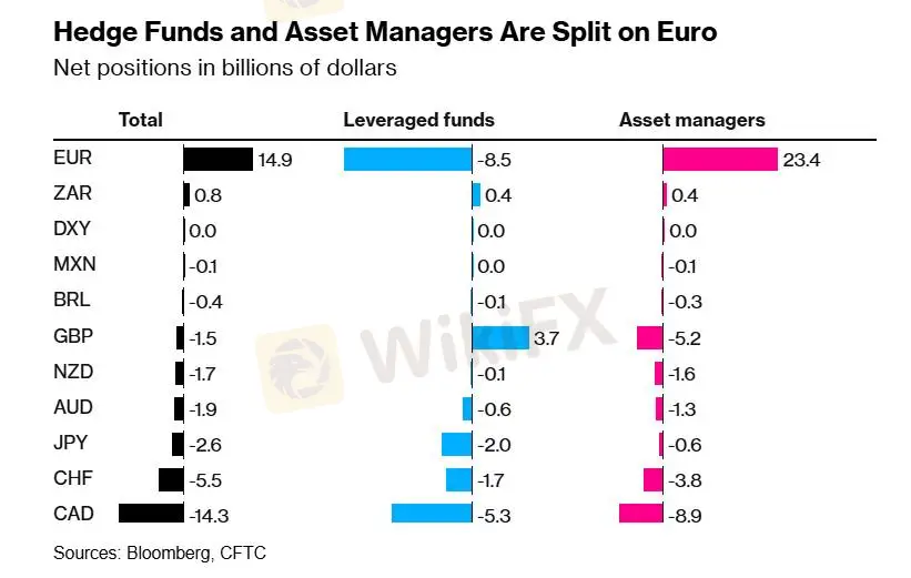 CFTC数据的细节显示,欧元在资产管理公司的头寸中占主导地位,他们的看涨押注规模达到234亿美元,尽管已从2023年5月的峰值640亿美元下降。这些投资者看跌加元、英镑和瑞士法郎。另一方面,杠杆基金则持有价值144亿美元的美元多头,主要是基于对欧元和加元的看跌押注。这类投资者通常对不断变化的市场趋势更为敏感。