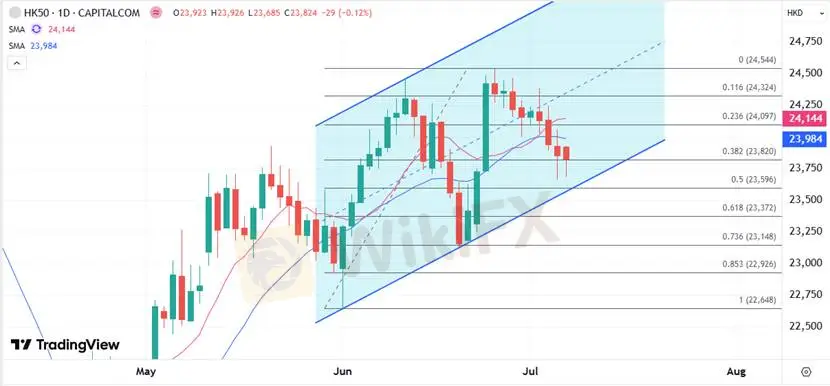 港股上周后半段表现欠佳,今日顺延跌势,因外围关注关税期限逼近,港股在缺乏消息面提振下由技术面调整暂时占主导。HK50指数今日连跌暂时守住上周低位,但23600仍作为当前支撑可能被测试,下方更关键支撑在上行通道底部,阻力则集中在日图主要均线范围集合了24000关口。