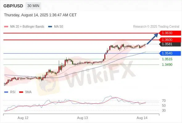 备选策略: 在1.3530上,看涨,目标价位定在1.3550,然后为1.3570。