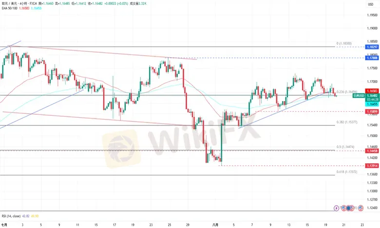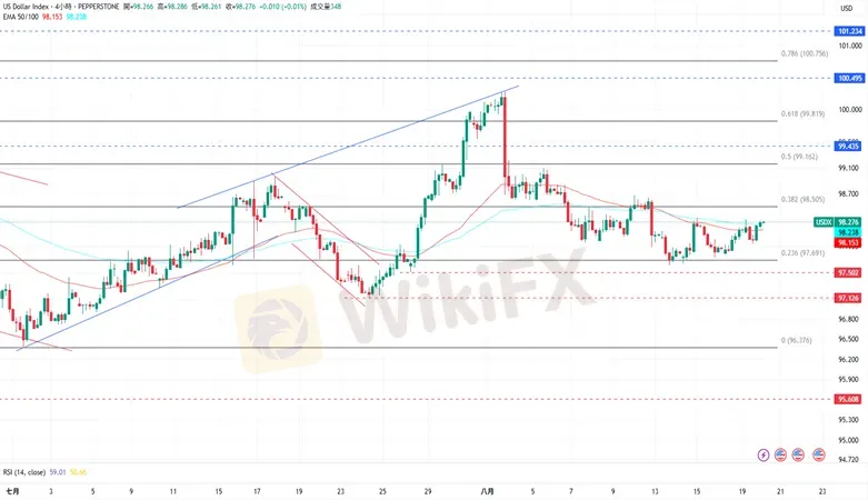 美元指数升至EMA50均线上方,并继续尝试突破98.00~98.340的阻力区间。上涨方面,美元指数接下来的阻力为8月11日的高点98.684,再来是斐波纳契0.5的99.162。下跌方面,若回落至EMA50下方,美元指数目前的支撑为8月13日的低点97.620,再来是7月24日低点97.126。