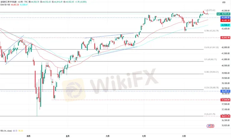 CPT Markets分析师指出,道琼指数继续在45000点的关键阻力水平波动。上涨方面,若再次突破45000点水平,道琼指数目前的阻力是8月15日的历史新高45202点。下跌方面,道琼指数目前的支撑为8月14日的低点44690点,接着为为44000点水平以及EMA50所在的44403点。