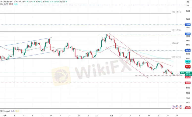 WTI原油受EMA50均线的负面压力影响,继续测试下方61.45美元的支撑水平。上涨方面,WTI原油目前的阻力为8月15日的高点64.15美元,再来是与8月6日的高点66.75美元。下跌方面,原油目前的支撑为8月18日的低点61.45美元,再来是斐波纳契0.236的61.14美元。