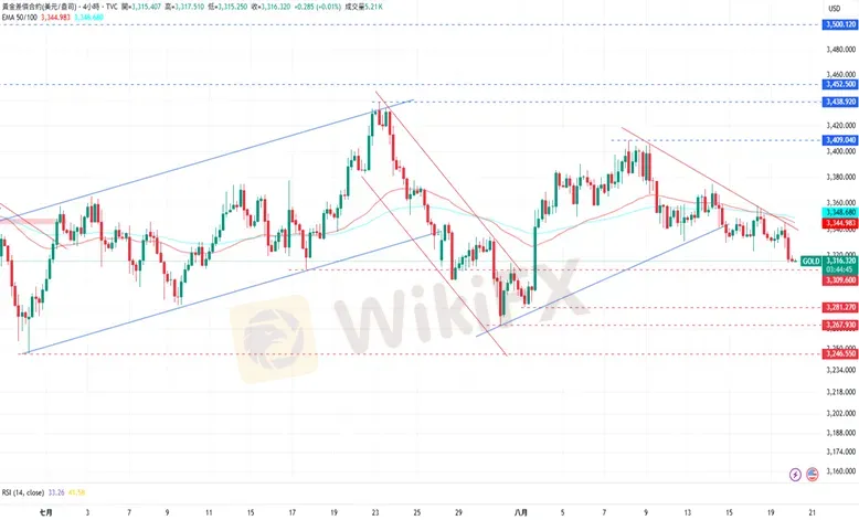 CPT Markets分析师指出,黄金受EMA50均线的负面压力,继续维持在下跌趋势线下方交易。目前RSI指标为32,须注意进入超卖区域后反弹的可能。上涨方面,黄金目前的阻力为8月18日高点3358美元,接着是8月14日的高点3374美元。下跌方面,黄金目前的支撑为3300美元关口,再来是8月1日低点3281美元。